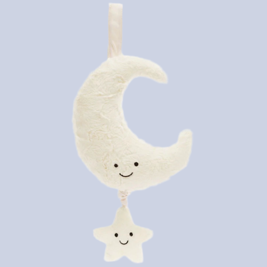 Gently pull the star and a charming original Jellycat lullaby plays from the Moon. With a Velcro fastening which can be attached to a crib or pram, the magic of the night sky can accompany baby whenever it is time to sleep.