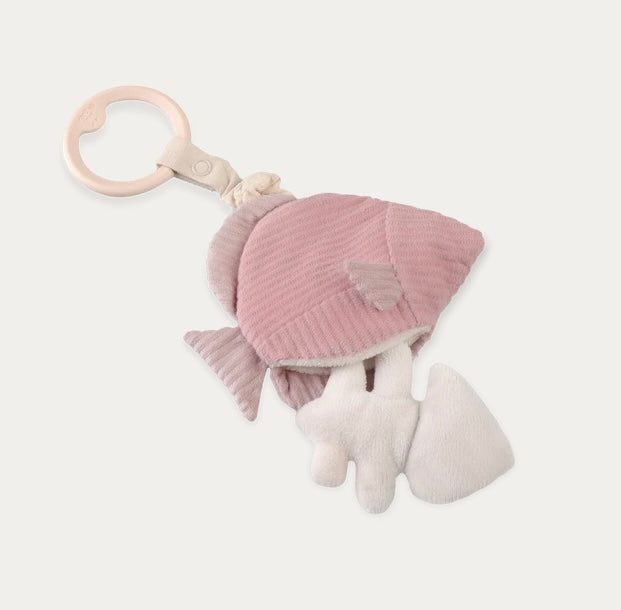 A small fishbone hides inside the ANGEL FISH's belly and your little one's face will light up when they discover what's inside! (Plus it rattles too!) Teach your little one the concept of object permanence and the basic motor controls of pulling the fishbone out with this activity friend.The fishbone is attached to the fish to keep them secure together. The tail end can be unbuttoned to hold a pacifier.