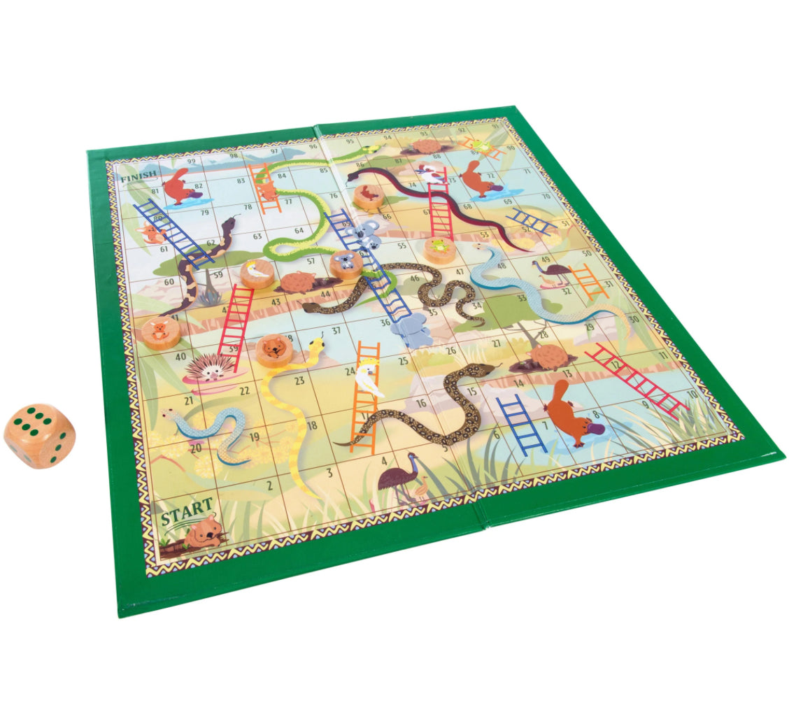 Aussie Animals Snakes and Ladders brings a uniquely Australian flavour to this timeless classic. This beautifully crafted board game features six wooden playing pieces and a wooden die, designed for engaging gameplay across all ages.