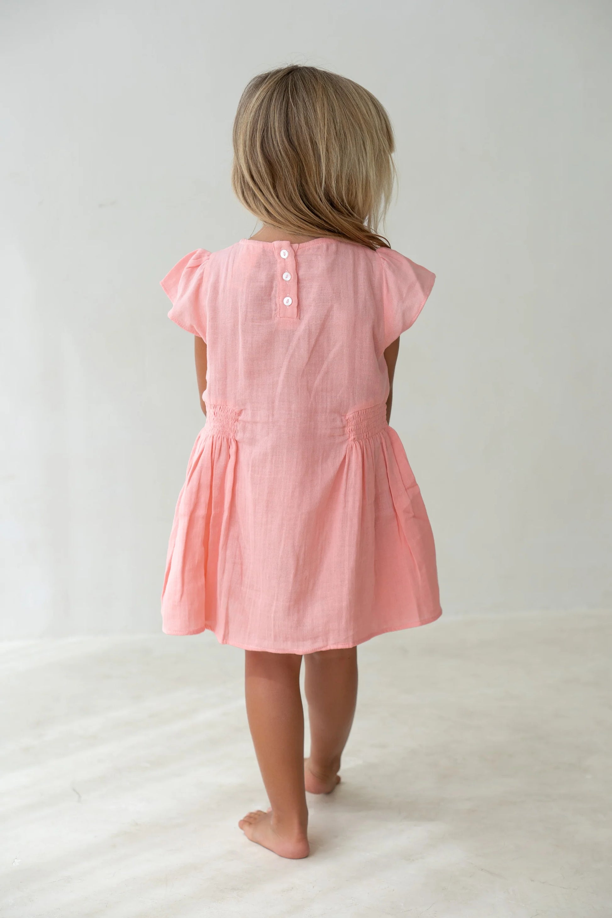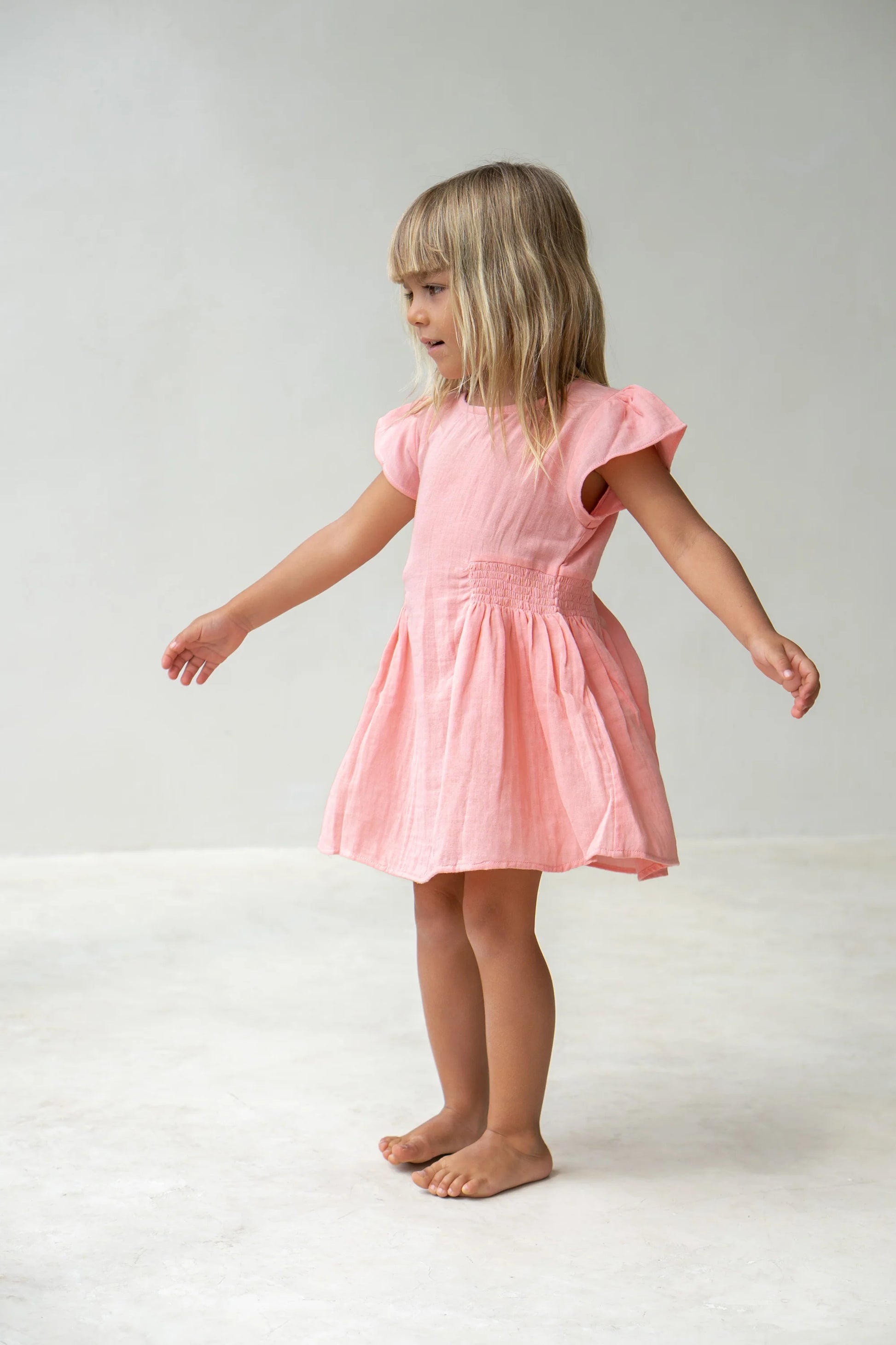 Effortless, delicate and oh-so-sweet - our beloved Blossom Dress is crafted from a lightweight and breathable cotton in our feminine coral hue. This is the perfect style for all occasions with shell buttons at the back and short flutter sleeves.