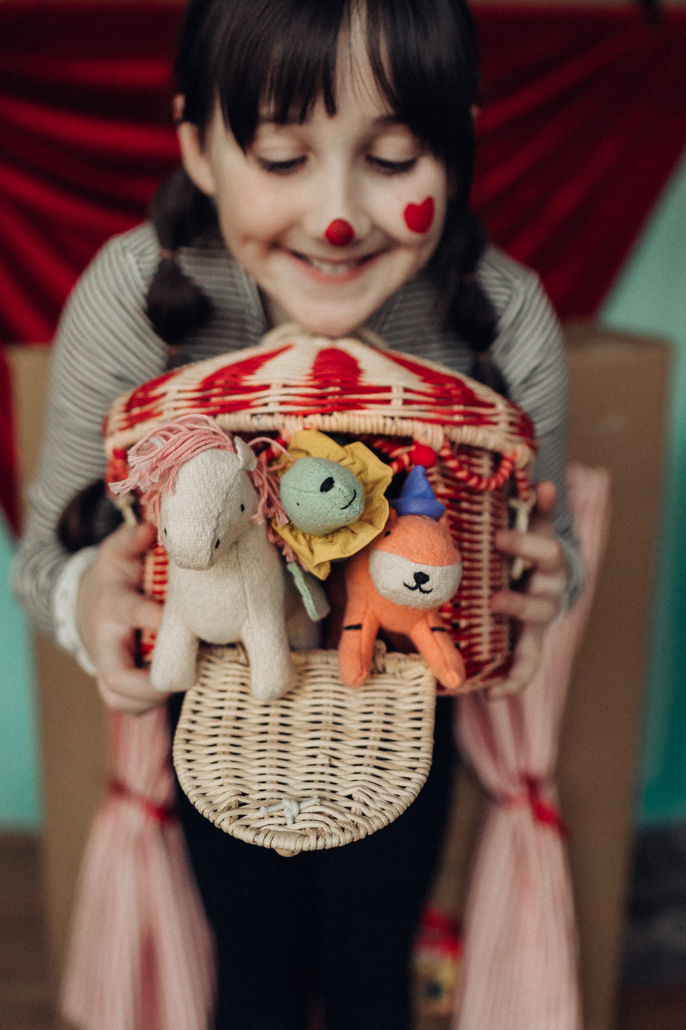 Roll up, roll up! Welcome to the big top! This is a circus tent set like no other, perfect to add some POP to your shelves! This circus tent storage basket brings your room and imagination to life. Our Circus Tent Basket doubles as an interactive circus toy and a storage solution, providing hours of fantastic play with circus animals and friends alike.