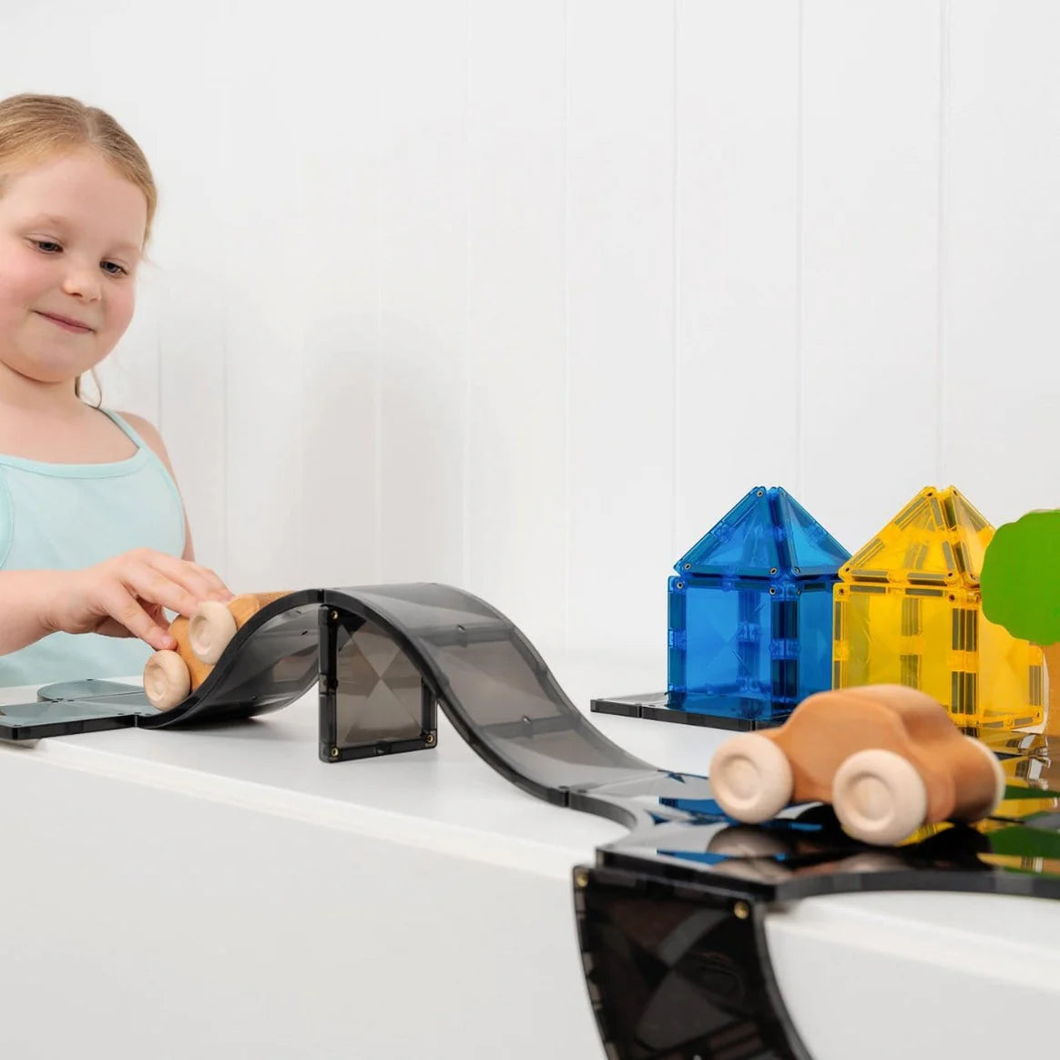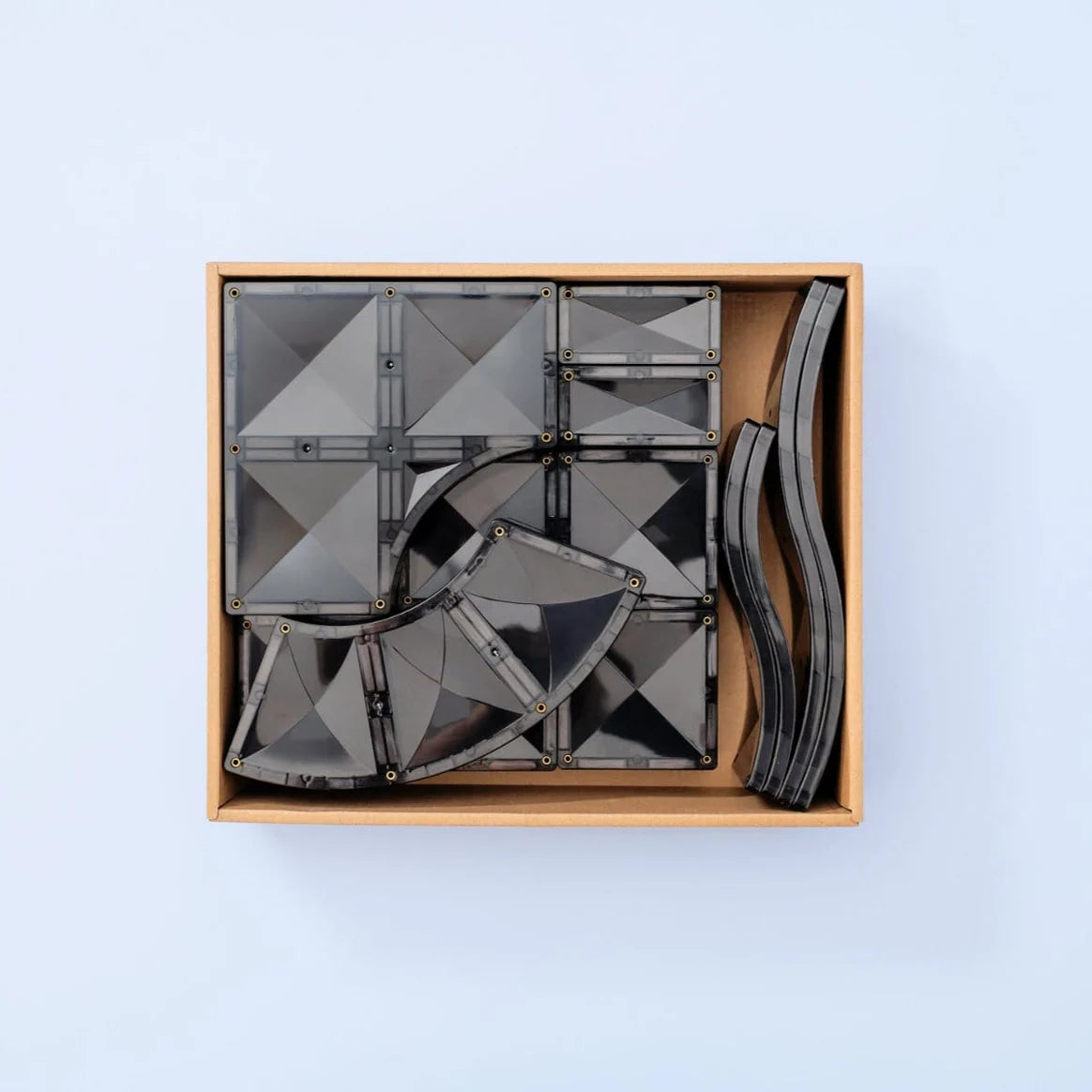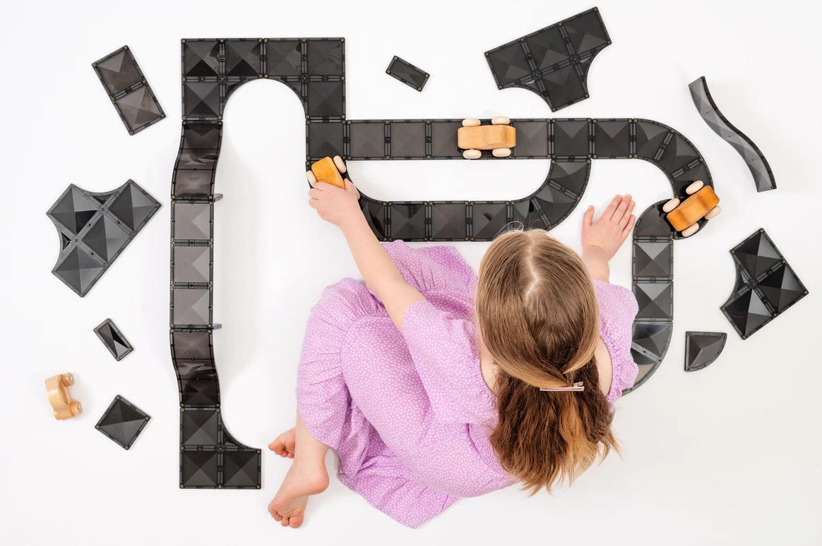 Elevate play and reach greater architectural heights with the CONNETIX 48 Piece Roads Creative Pack. Featuring an exciting range of thoughtfully designed magnetic tile shapes, including quarter circles, arches, intersections, and ramps, all in a sleek black shade, this pack will enhance the construction of roads, raceways, skateparks, cities, plus so much more! The purposeful introduction of black tiles enhances the visual of roads, ramps, and runways, while the exclusion of white lines and road markings maintains the open-ended nature intended by CONNETlX products, allowing children to reimagine pieces into their own creative builds.