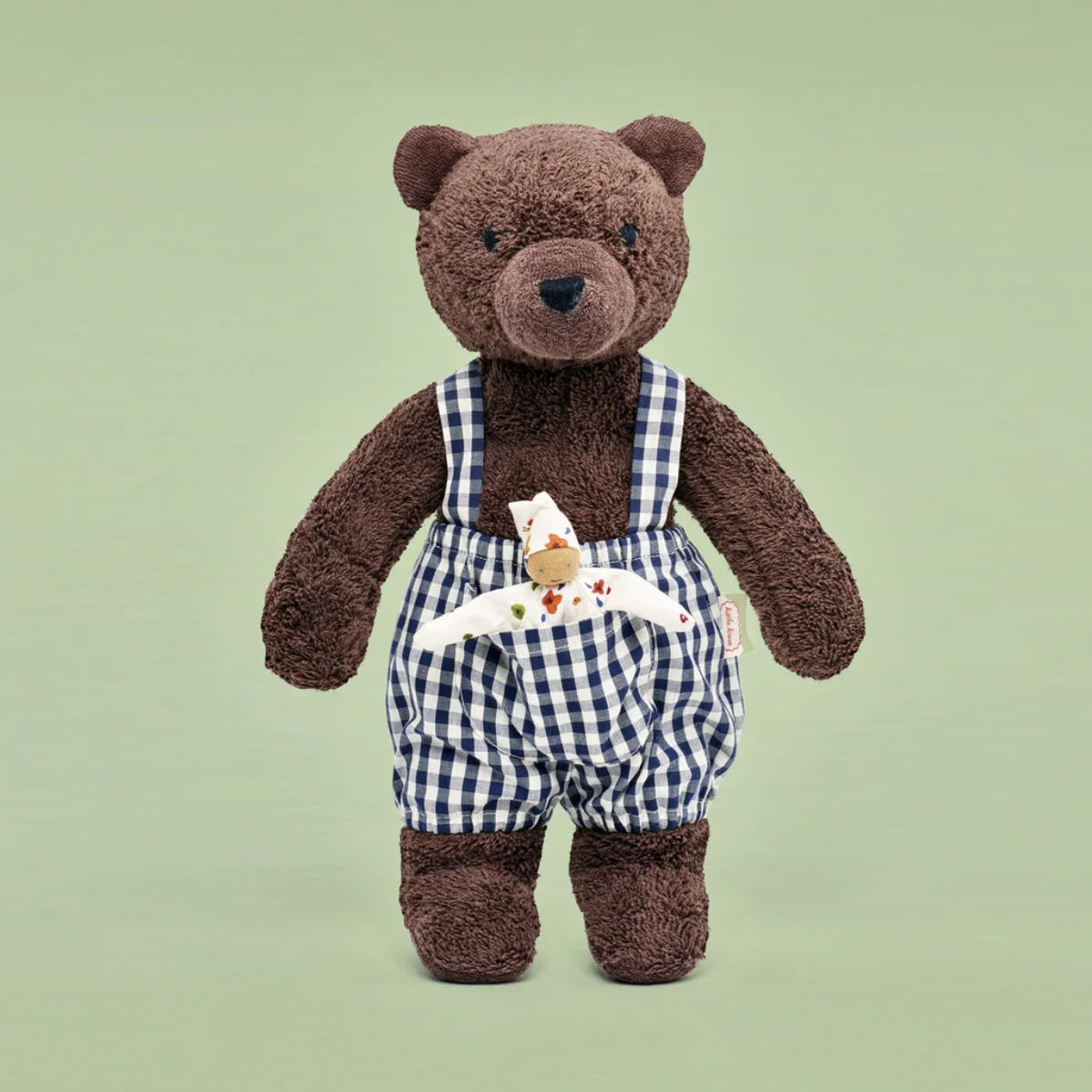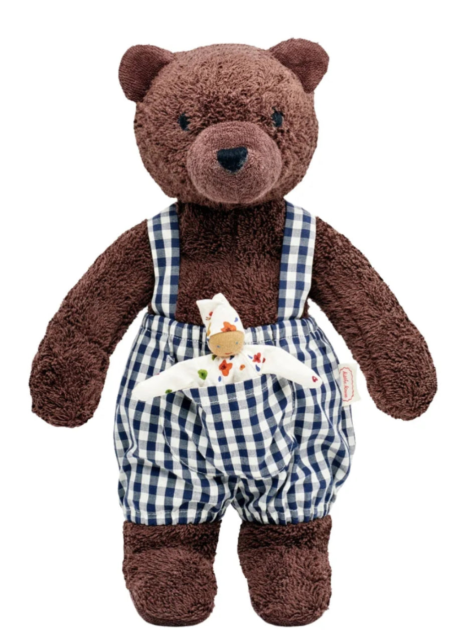 This adorable bear is dressed in checkered dungarees and comes with a mini Waldorf-inspired doll in a floral print to join in on their adventures.