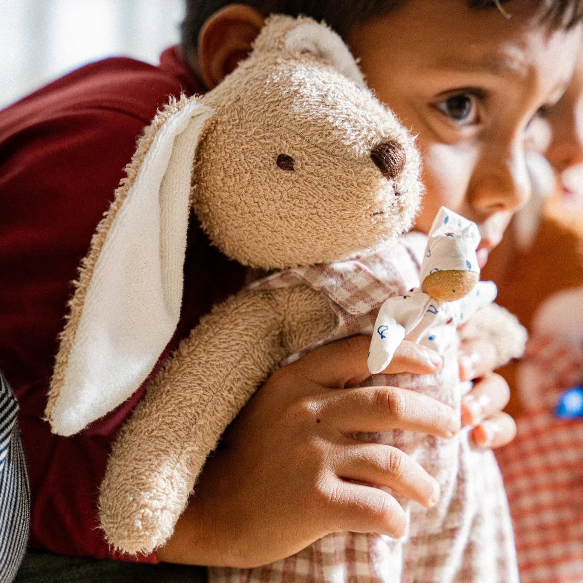 Hugo the Rabbit is a charming bedtime buddy and playtime pal for your little one. It's dressed in brown flanel overalls, and comes with a mini Waldorf-inspired doll in its front pocket to join in on their adventures!