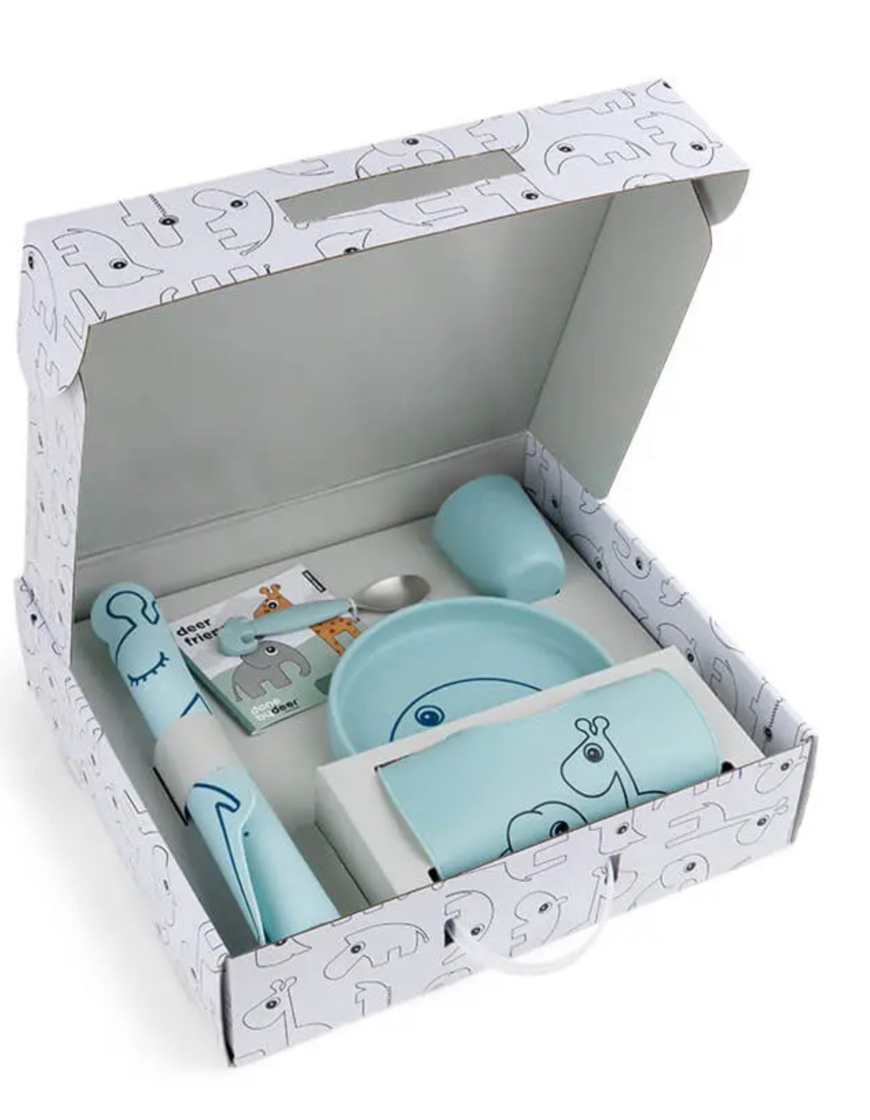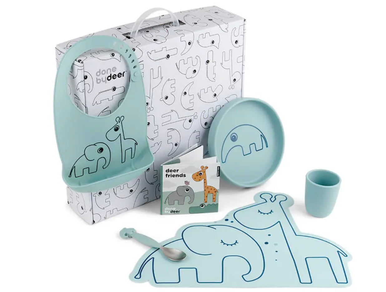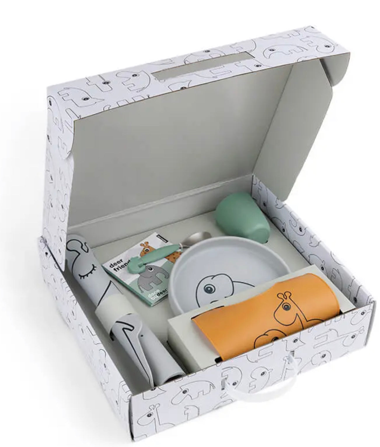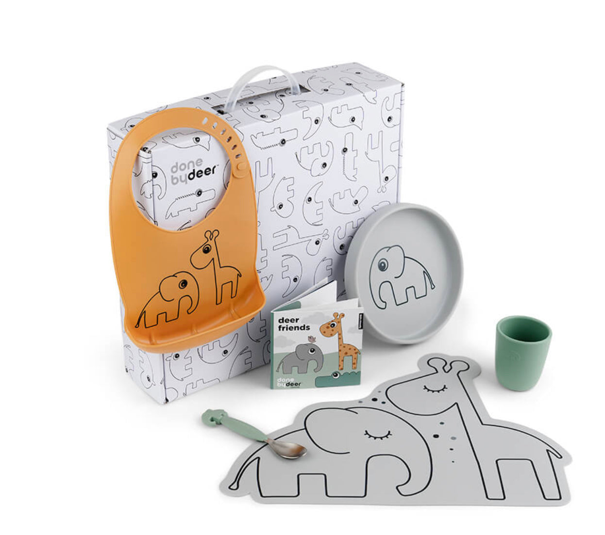 INCLUDES: Silicone Plate, Silicone Mini Mug, Peekaboo Bib, Silicone Placemat and Easy-Grip Spoon. Also includes complimentary Deer Friends book.