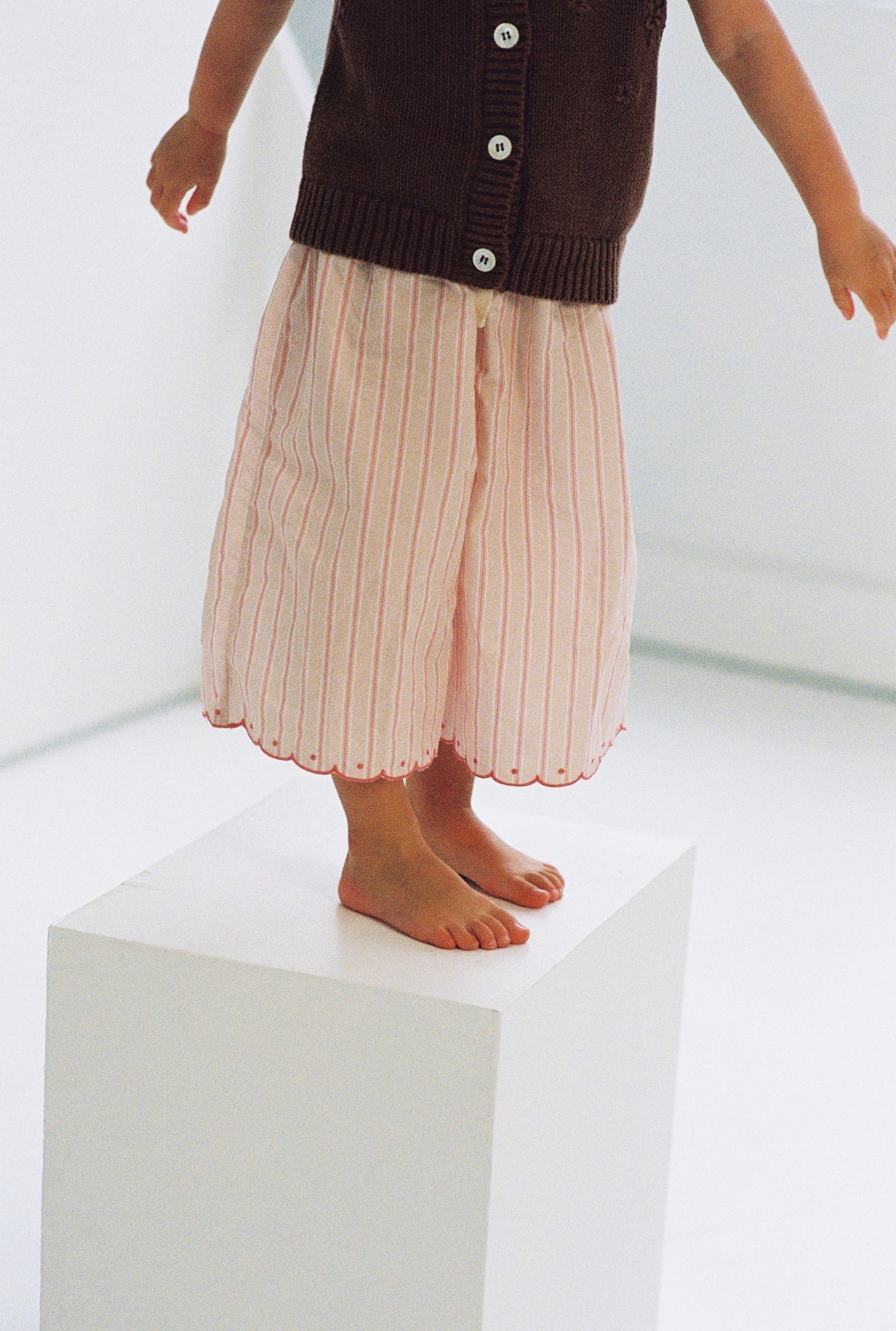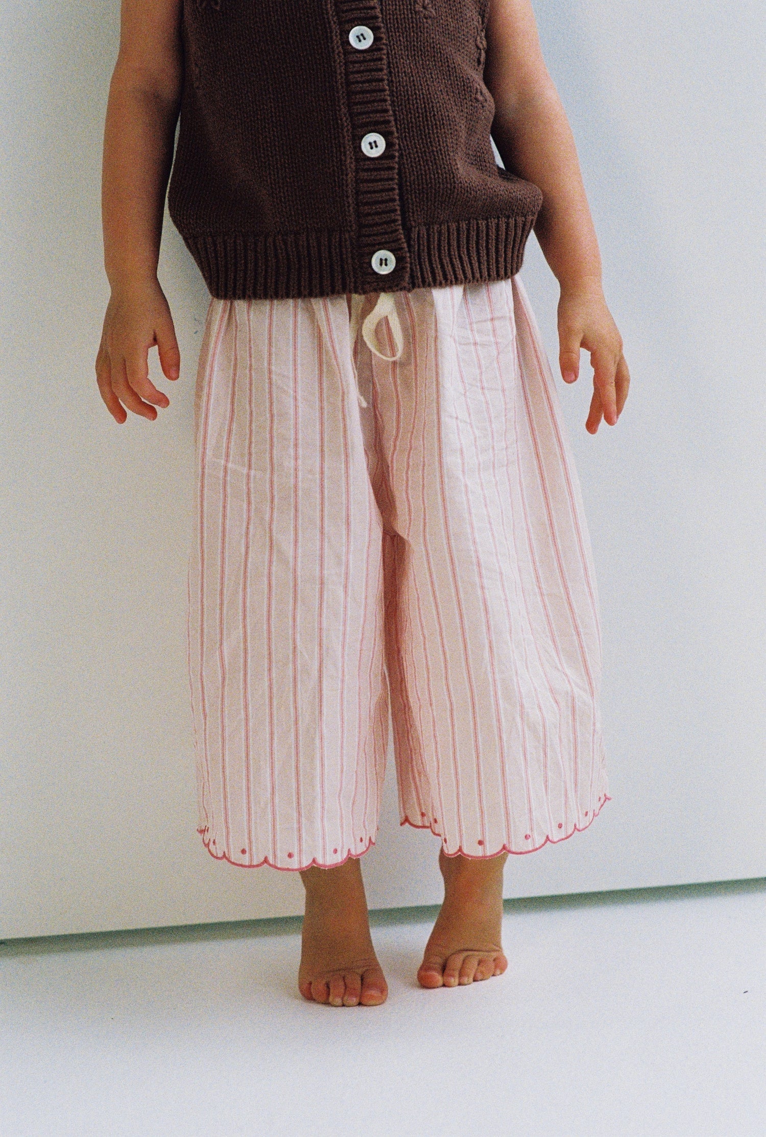 Crafted from durable cotton poplin, the Fleur Pant in our new Pink Stripe is a playful essential with a relaxed 3/4 wide-leg silhouette. Featuring custom stripe detailing and scalloped embroidery at the hem, it combines style with comfort. An elasticated waistband and functional drawstring ensure an easy, adjustable fit for all-day wear.