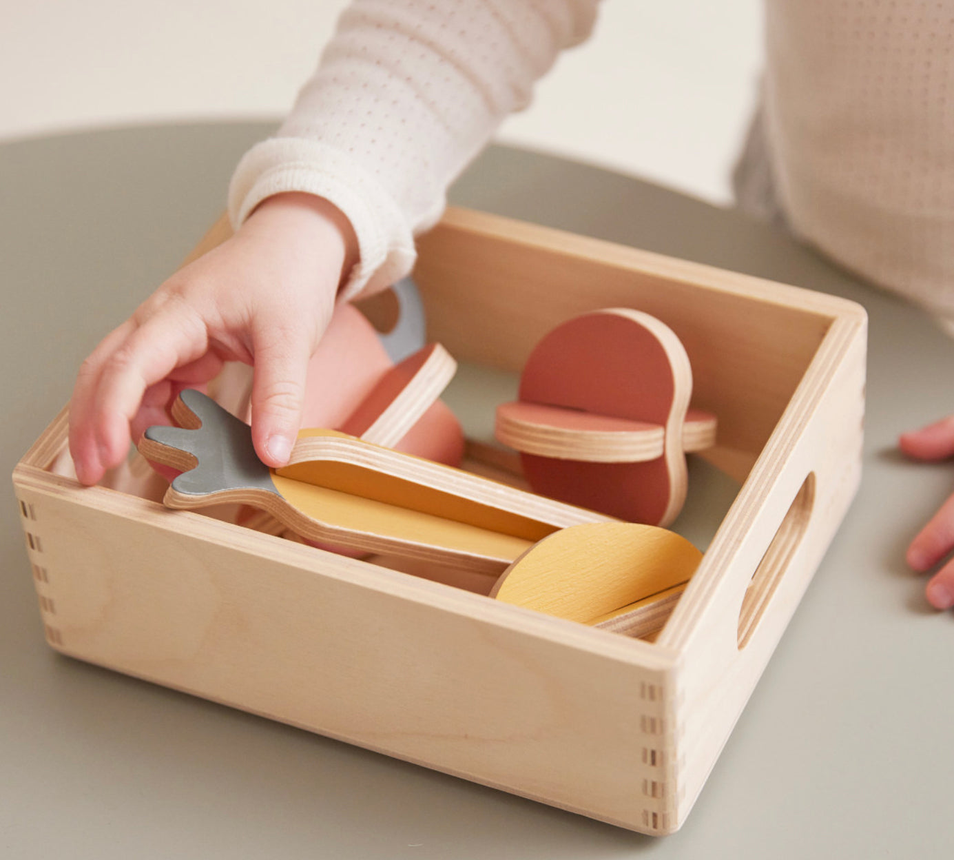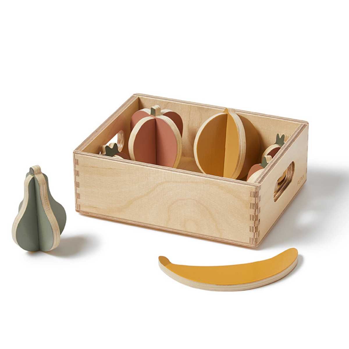 Made from FSC certified solid, natural wood, the 8 piece set includes; a banana, an apple, an orange, a pear, 3 strawberries, and 1 wooden storage crate.