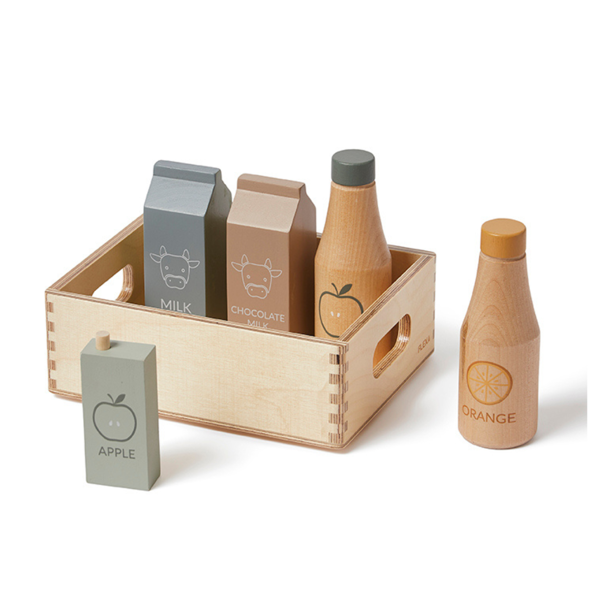 Made from FSC certified solid, natural wood, the set includes a milk carton, chocolate milk, orange juice, apple juice, a small carton of apple juice, and a wooden storage crate.