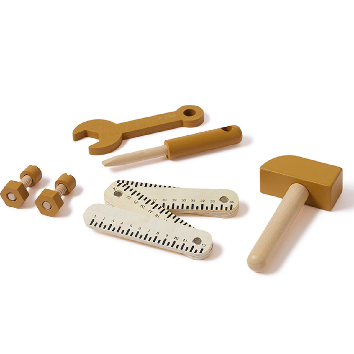 Made from FSC certified solid, natural wood, the set includes; a hammer, a folding ruler, a screwdriver, a wrench, screws, and bolts.