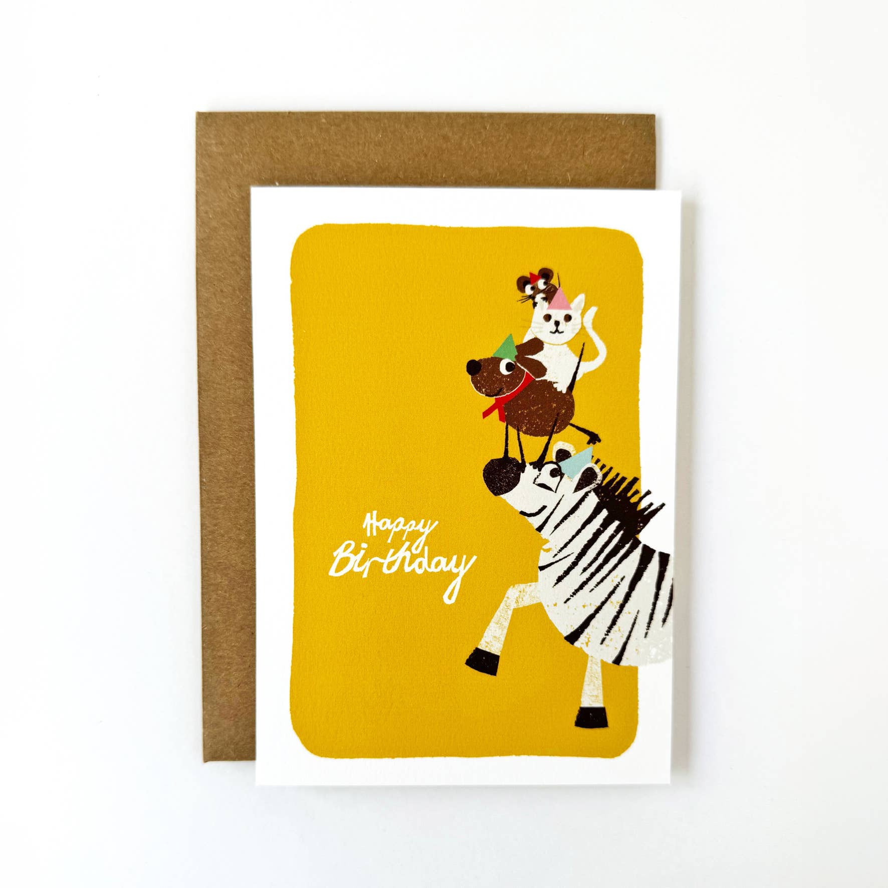 Our Happy Birthday Party Animals card is size A6 and printed on a beautiful FSC approved paper. The card comes with a recycled Kraft envelope.