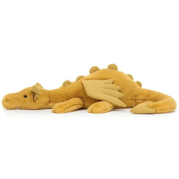 Golden Dragon is gorgeously cuddlesome. With soft golden fur, a long curved tail and sparkling jersey spines, ears and wings, this mighty pal gives legendary hugs. And just as a dragon guards their gold, this one looks after their friends!