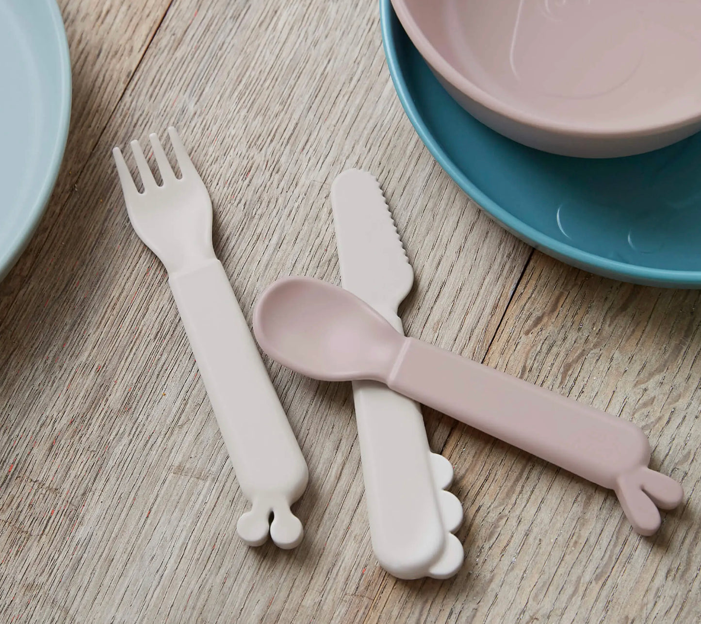 The adorable Kiddish cutlery set features round edges for little ones to safely practice independent eating.