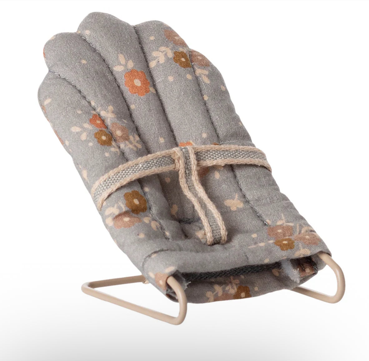 Tuck your tiniest Maileg friends into this charming Babysitter My in Blue. Designed with a petite floral-print fabric in earthy blue tones and secured with a sweet cotton harness, it fits baby mice and My-sized rabbits & bunnies perfectly. The soft quilted seat and sturdy metal frame create a delightful setting for playtime or naptime, making it a must-have accessory in your Maileg world. A beautiful balance of comfort and Nordic nostalgia. Measures H8cm x W6cm.