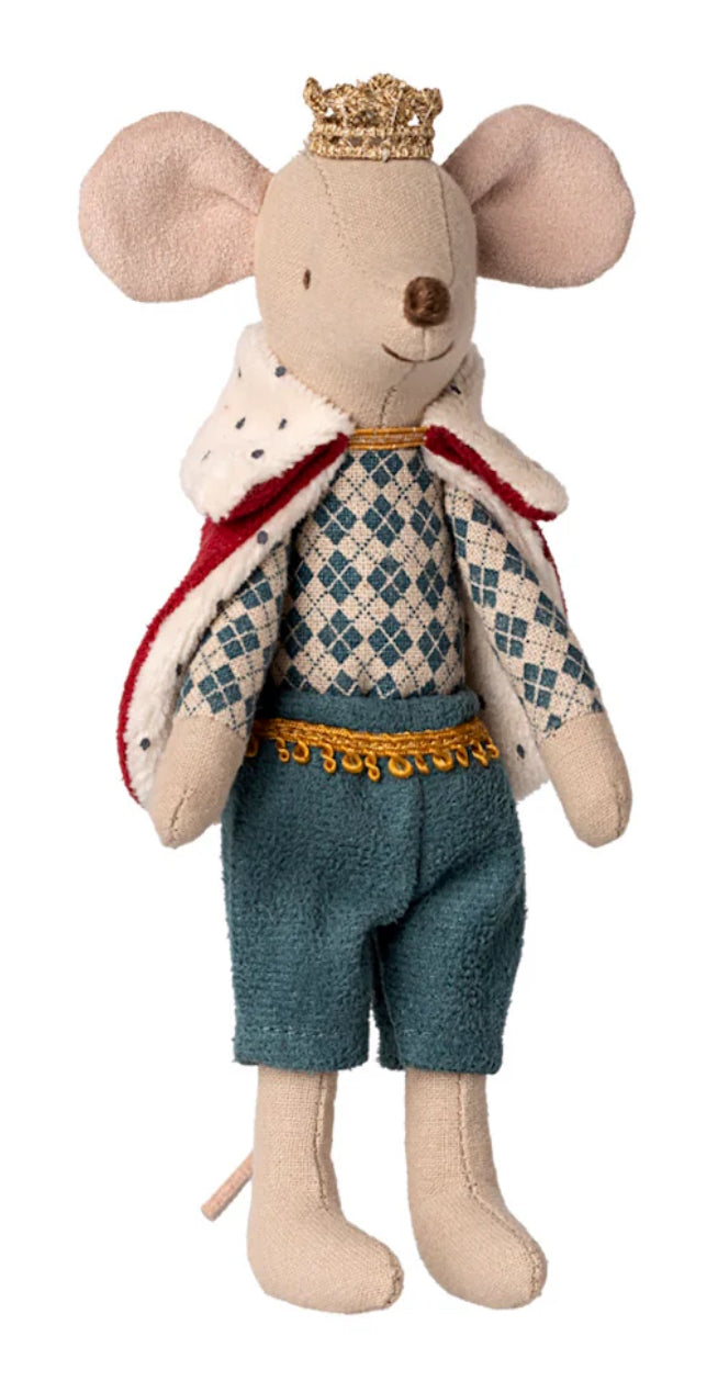 All rise for His Majesty! The Maileg King Mouse Dad brings regal charm and timeless elegance to the Maileg royal family. Dressed in detailed harlequin-style top, deep teal trousers, a plush faux-fur-trimmed cloak and a golden crown, he exudes gentle authority and warmth.