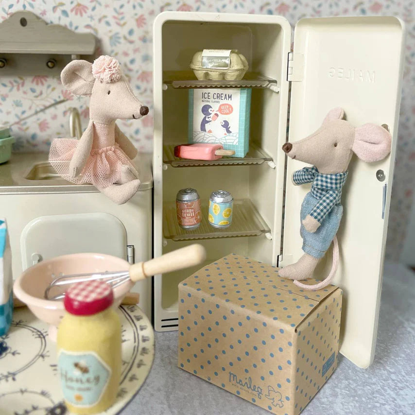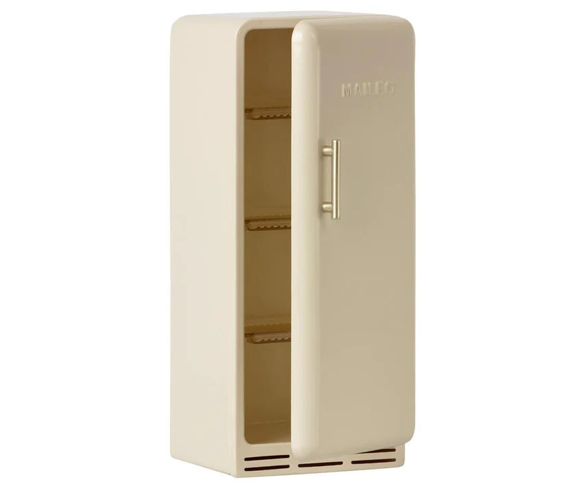 An old fashioned fridge that fits perfectly into the House of Miniature dollhouse. The fridge is made of metal with a magnetic lock and frosted shelves inside. A great addition to this fridge is our Miniature grocery box.