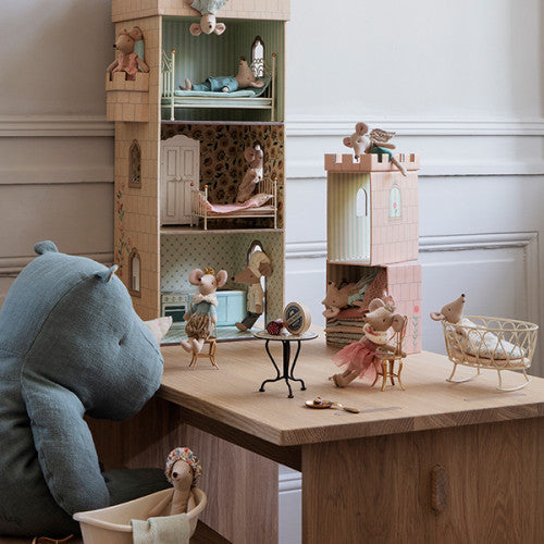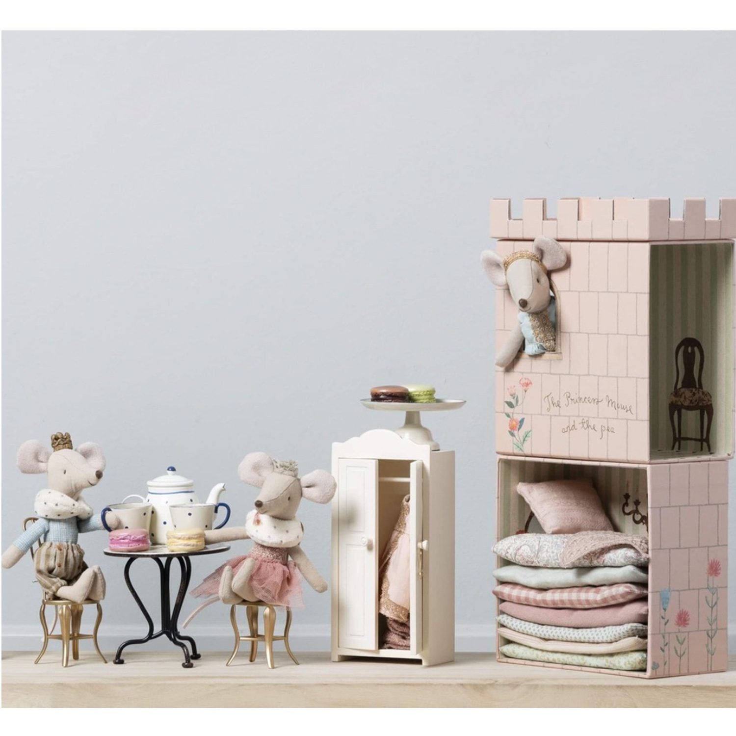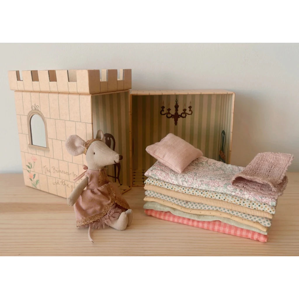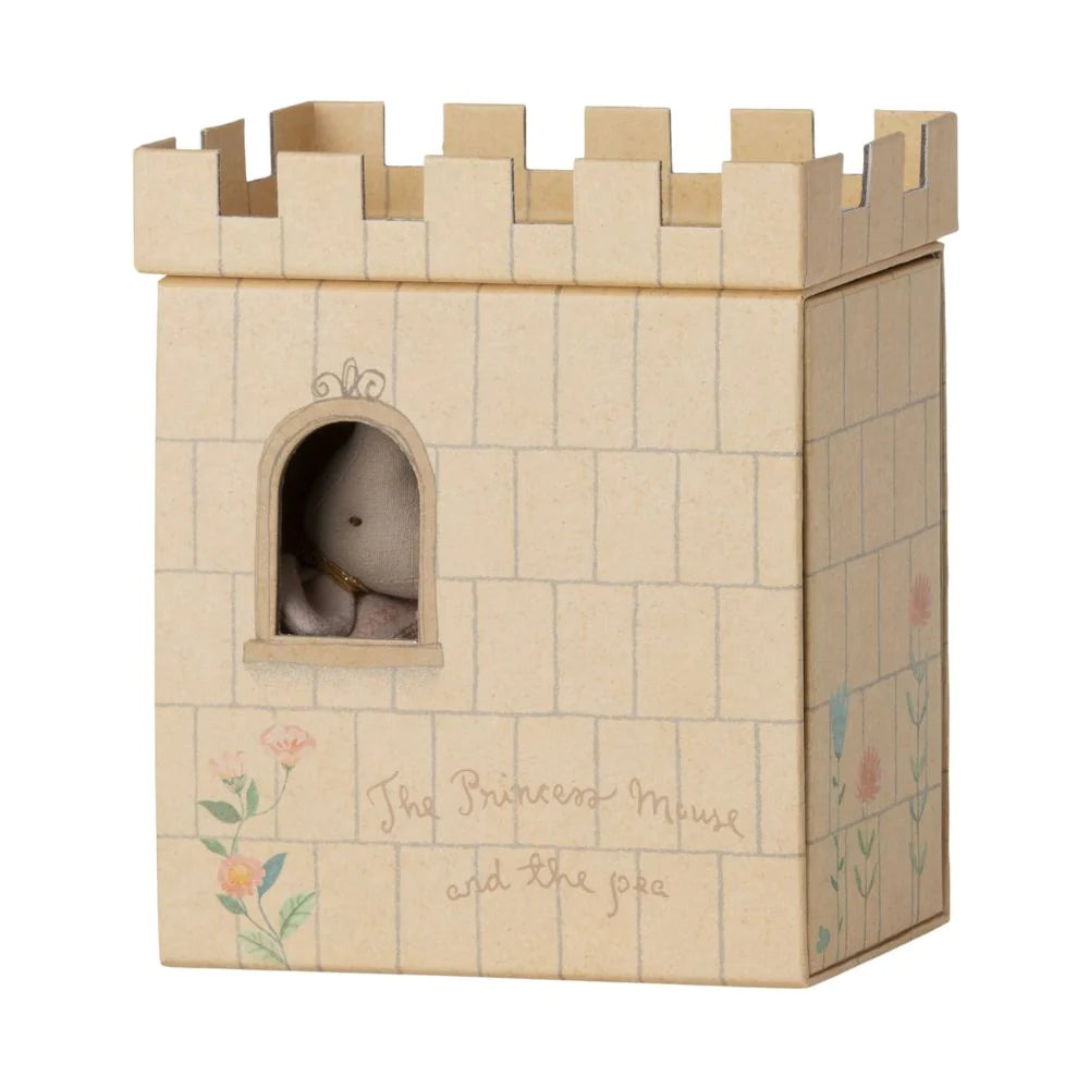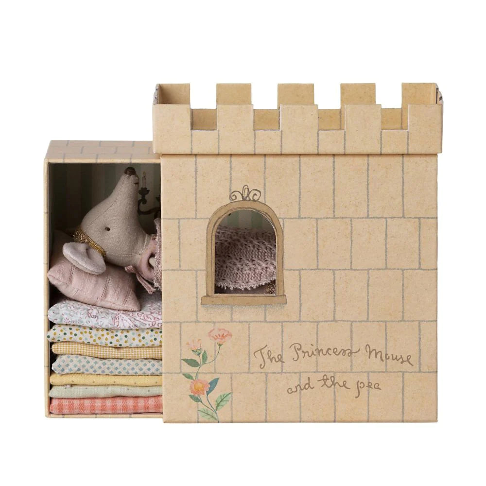 A classic Maileg item. This playset is inspired by the famous fairy tale Princess and the pea. This set includes a cardboard castle with mattresses, a pea and a big sister princess mouse.