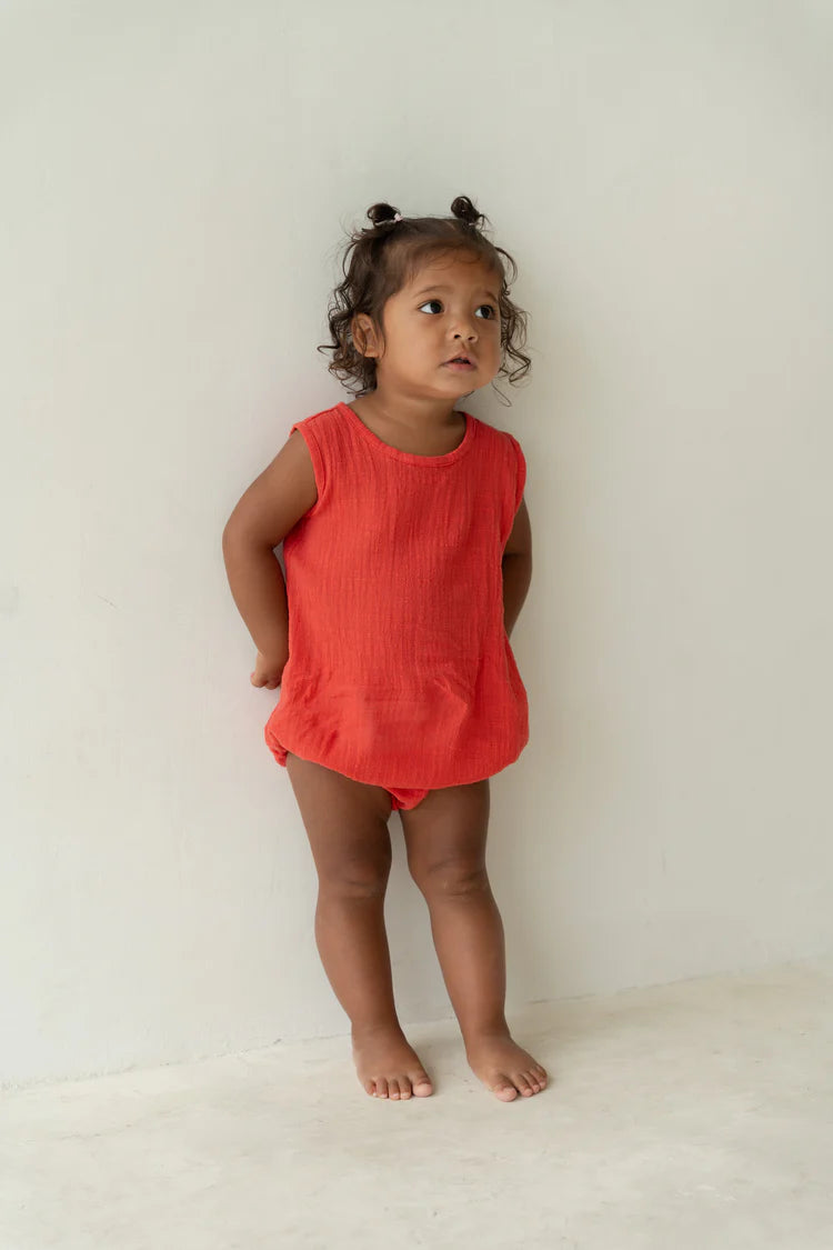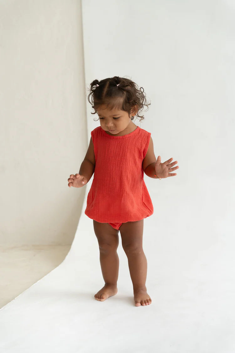 Dress your little one in the adorable Mars Romper, a lightweight and playful summer essential. Made from soft cotton muslin in a sun-infused watermelon hue, it ensures comfort during warm days. With natural coconut buttons and handy press studs at the crotch, changing is a breeze.