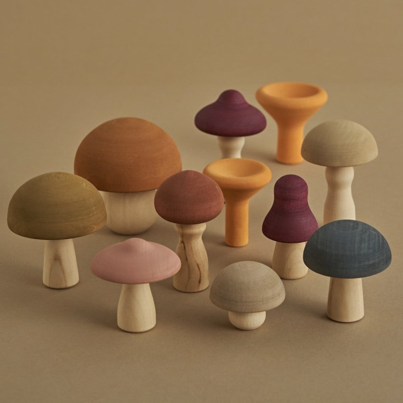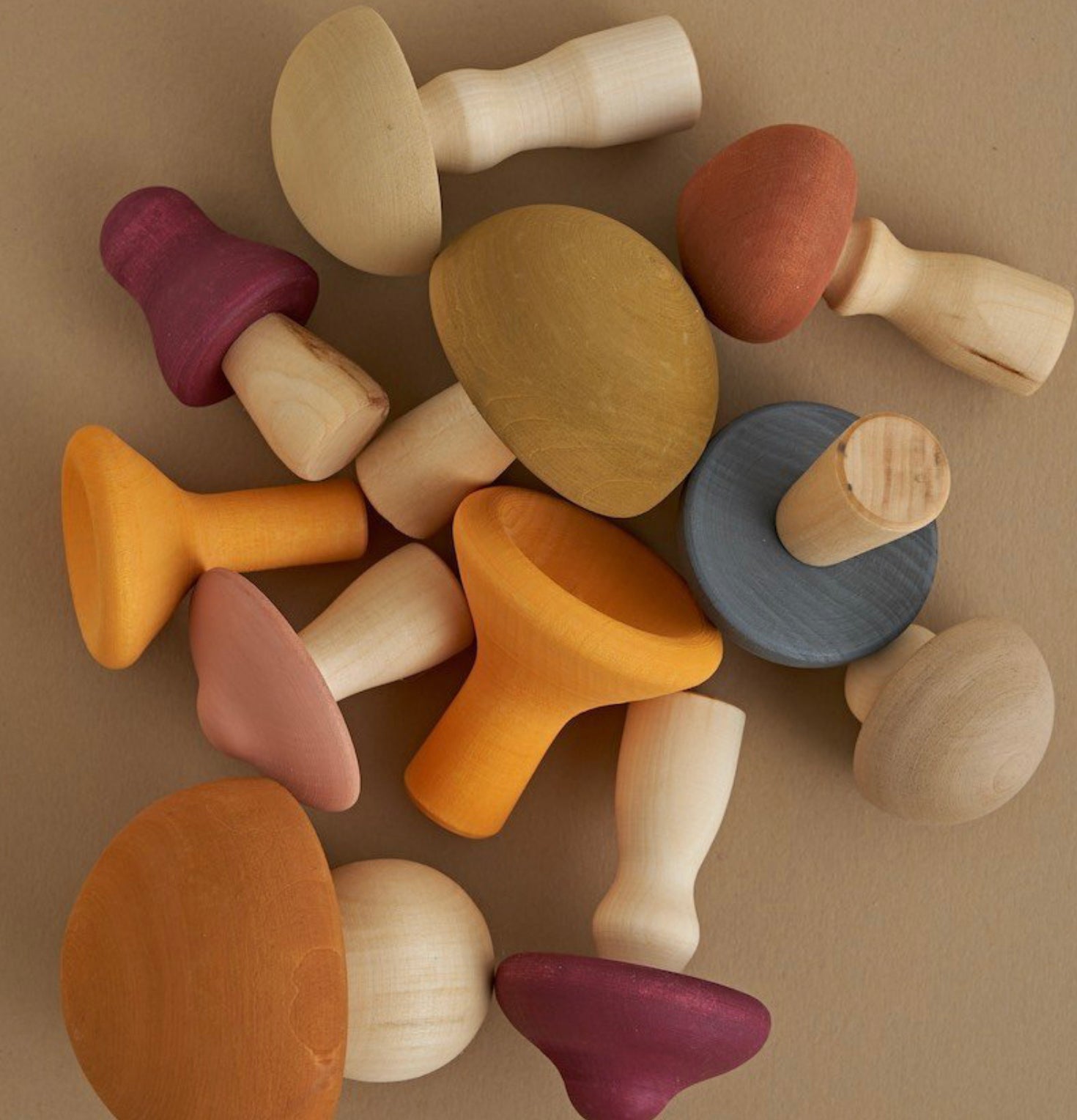 Wander through the imaginary forest, picking mushrooms of all shapes and sizes from your Raduga Grëz Wooden Mushrooms Set.