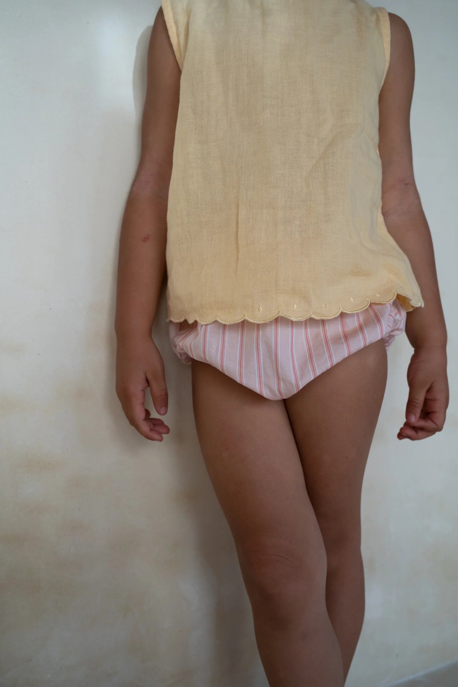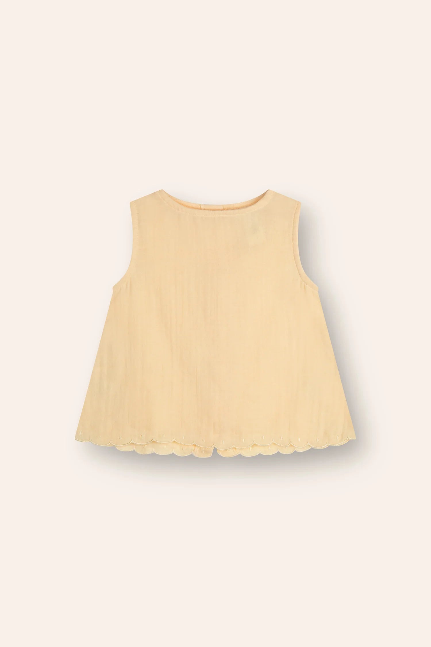 The Nora Blouse in Butter is a lightweight essential designed for everyday ease. Featuring a gently flared silhouette, scalloped embroidery at the hem and delicate shell buttons down the back, this piece offers a soft balance of function and charm — perfect for pairing with bloomers, skirts, or layered under overalls.
