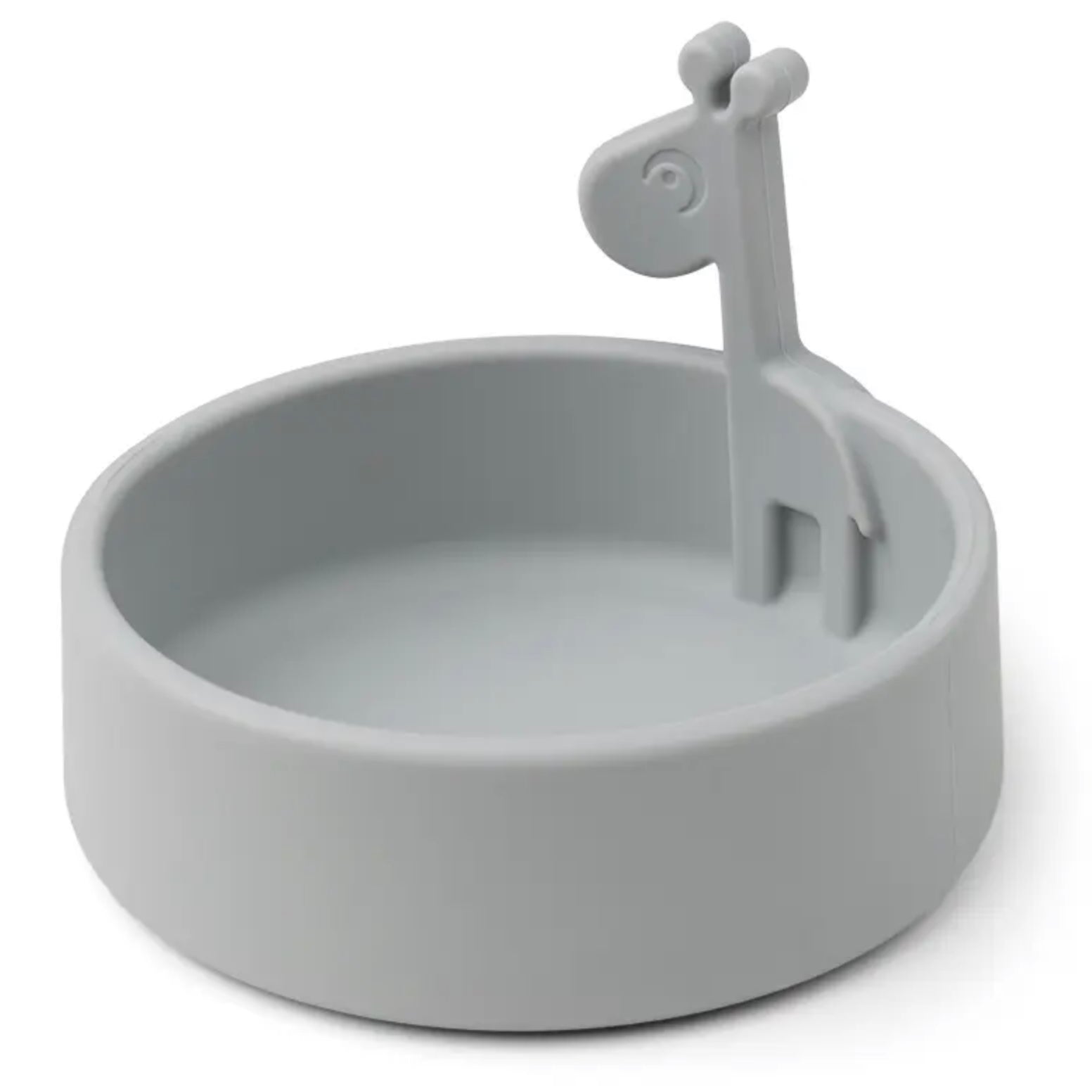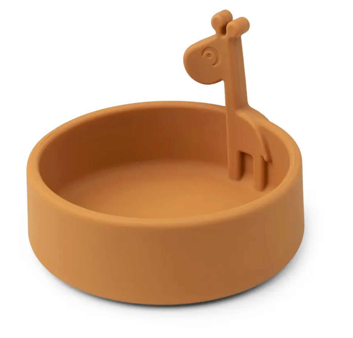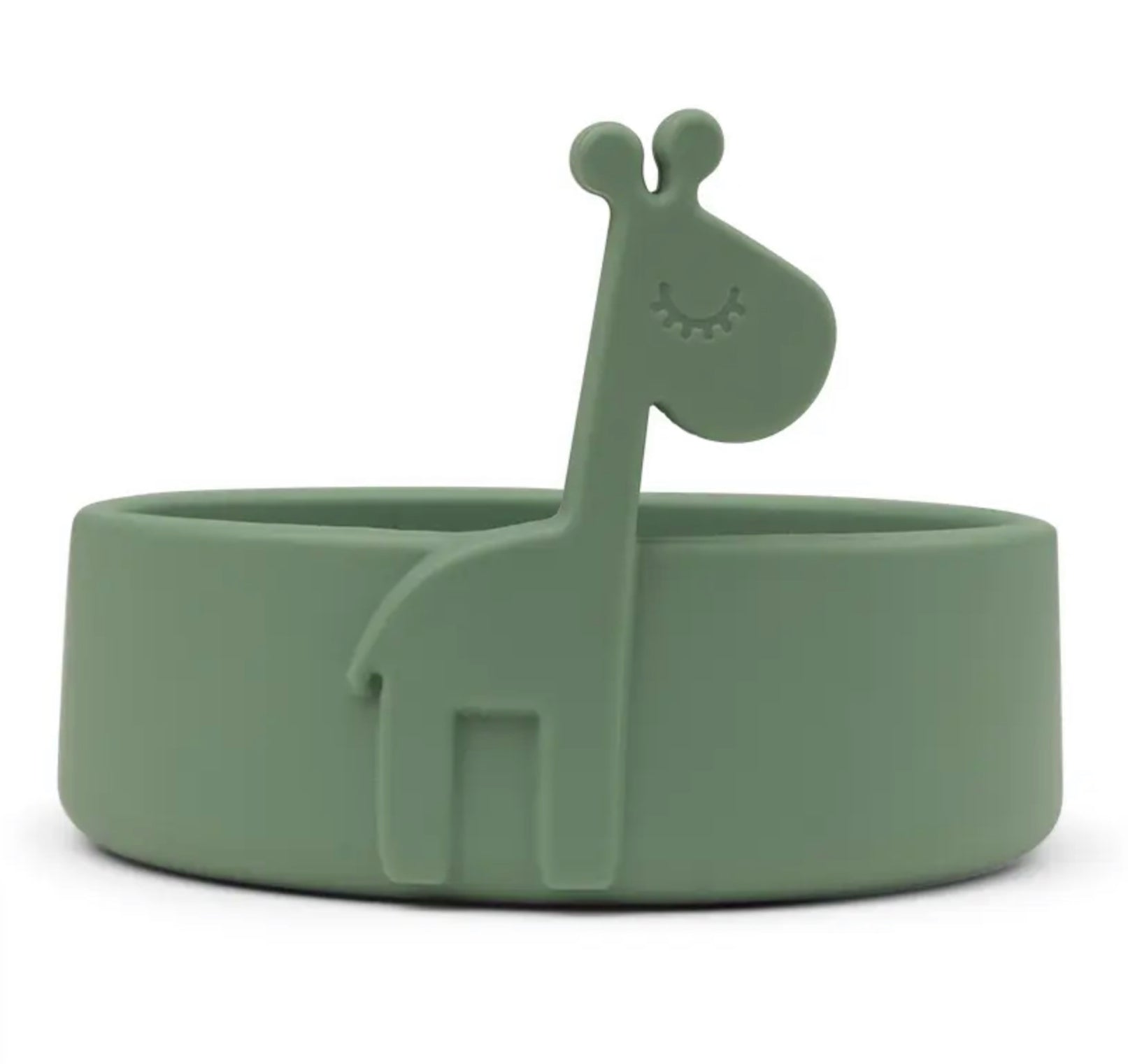 The adorable Raffi peeks out from the side of the practical silicone bowl ready to make meal time extra fun.