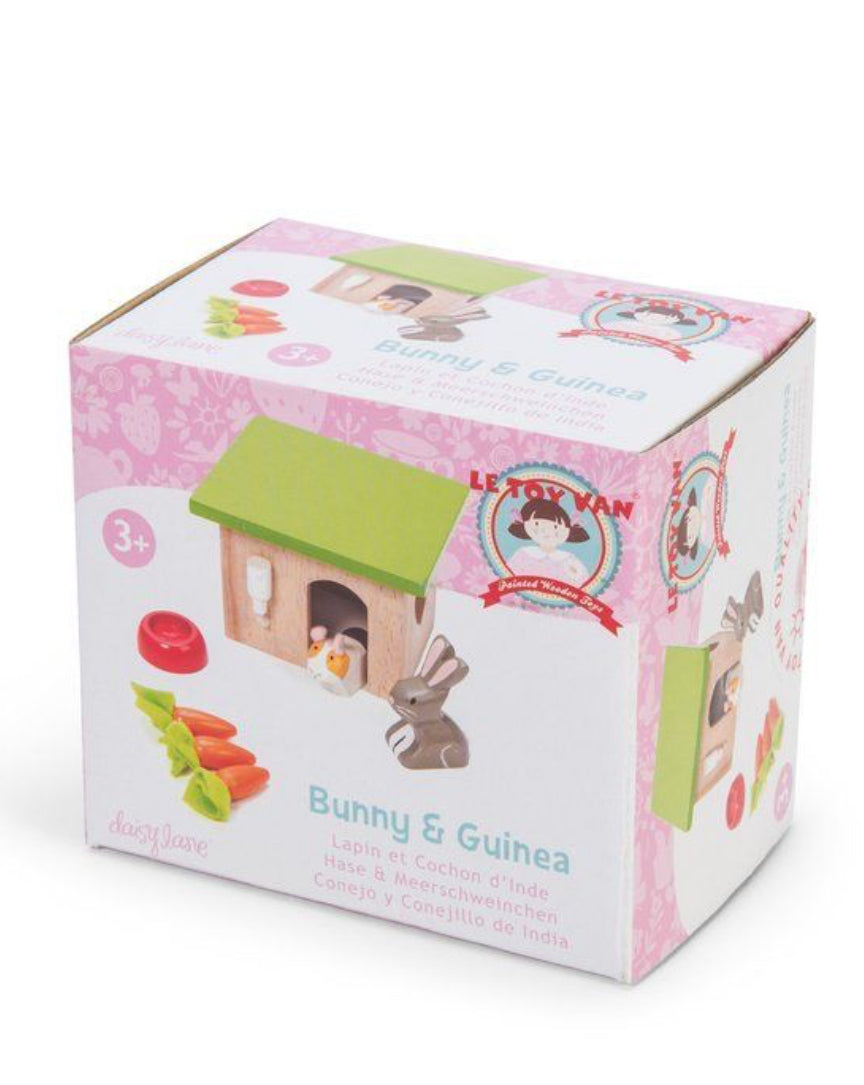 Teach your child about the value of caring for pets with this bunny and Guinea Pig set. This educational and fun wooden set, comes with three carrots, a water bowl and a house for their cute, wooden friends.