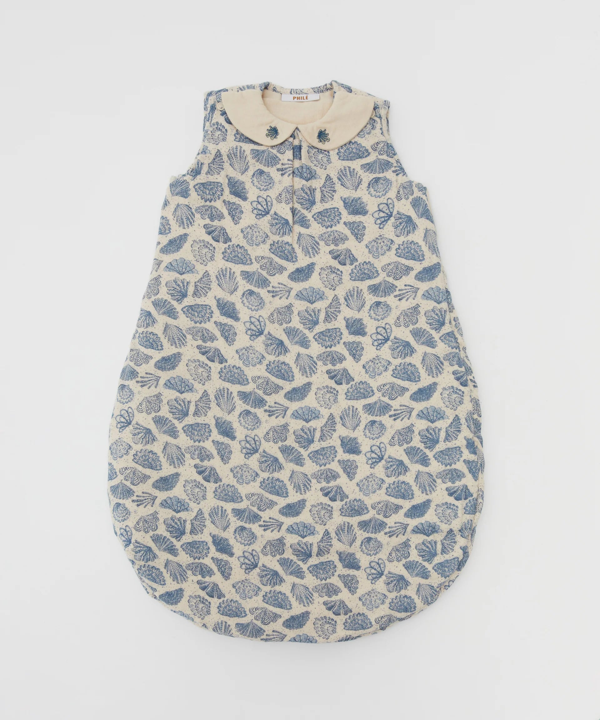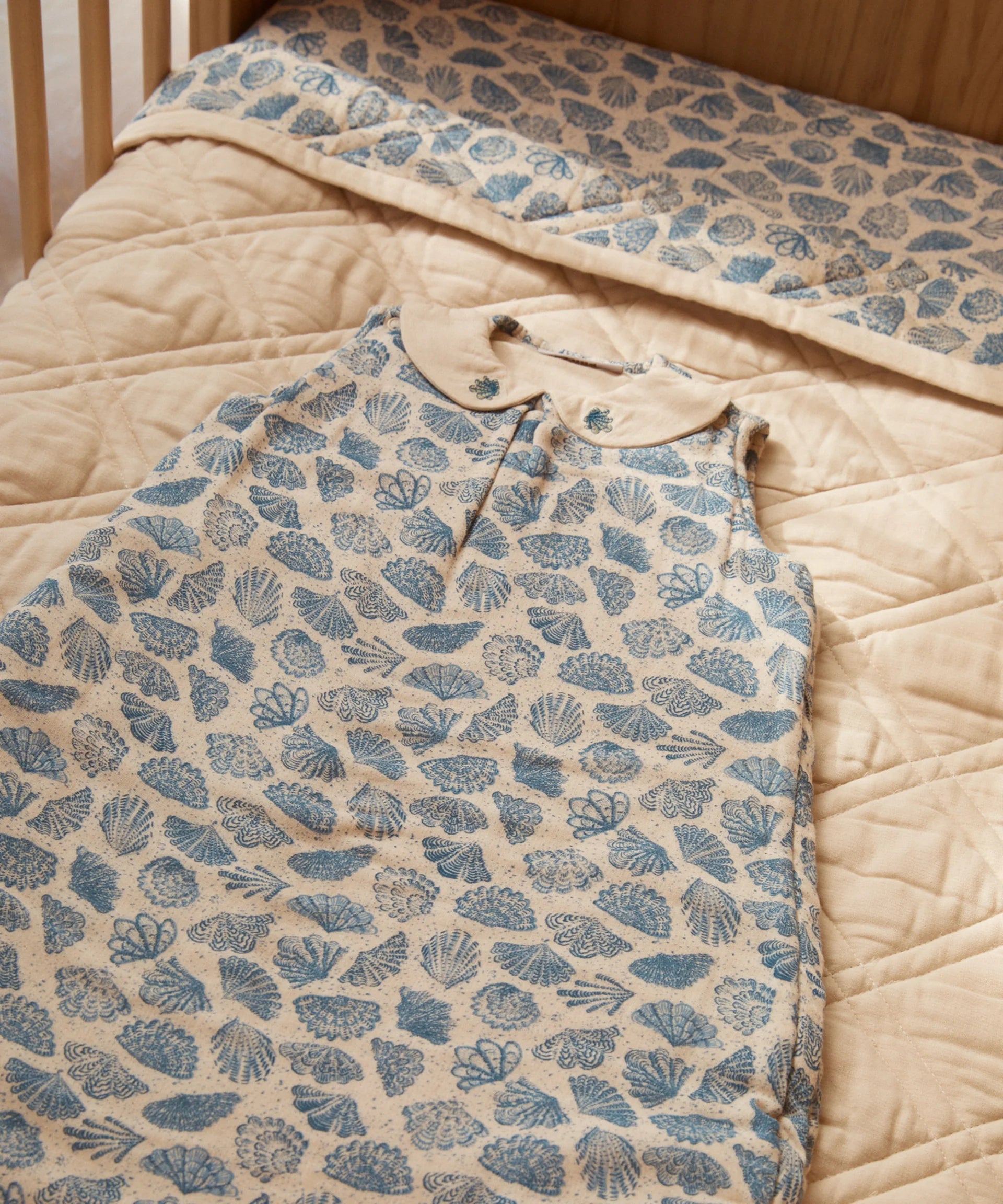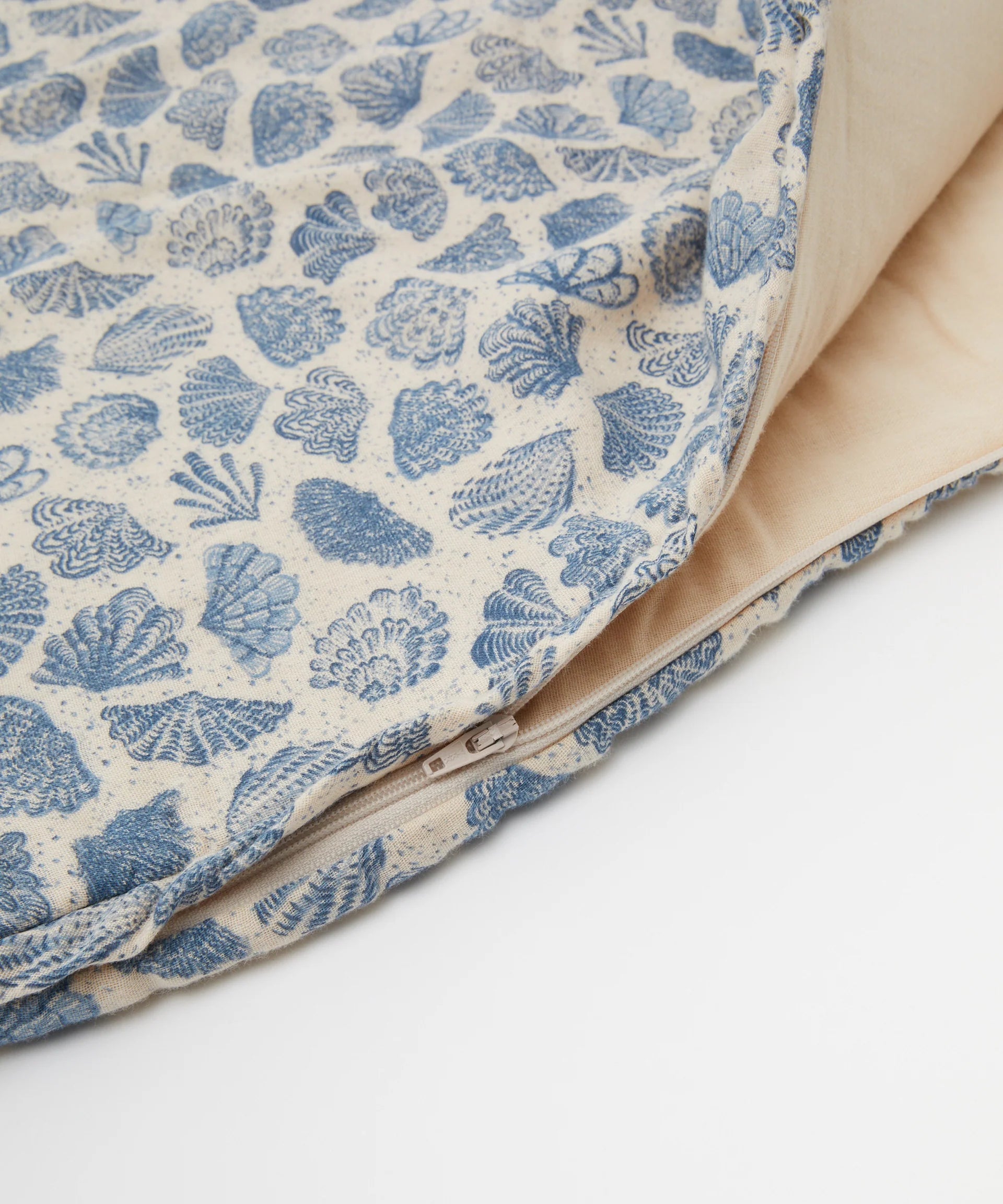 The Oceanides Collection is built around artist Lucie de Moyencourt's shell illustrations, and adapted by her into a timeless textile print. Luxurious elements include embroidered seashells, quilting and pom poms.
