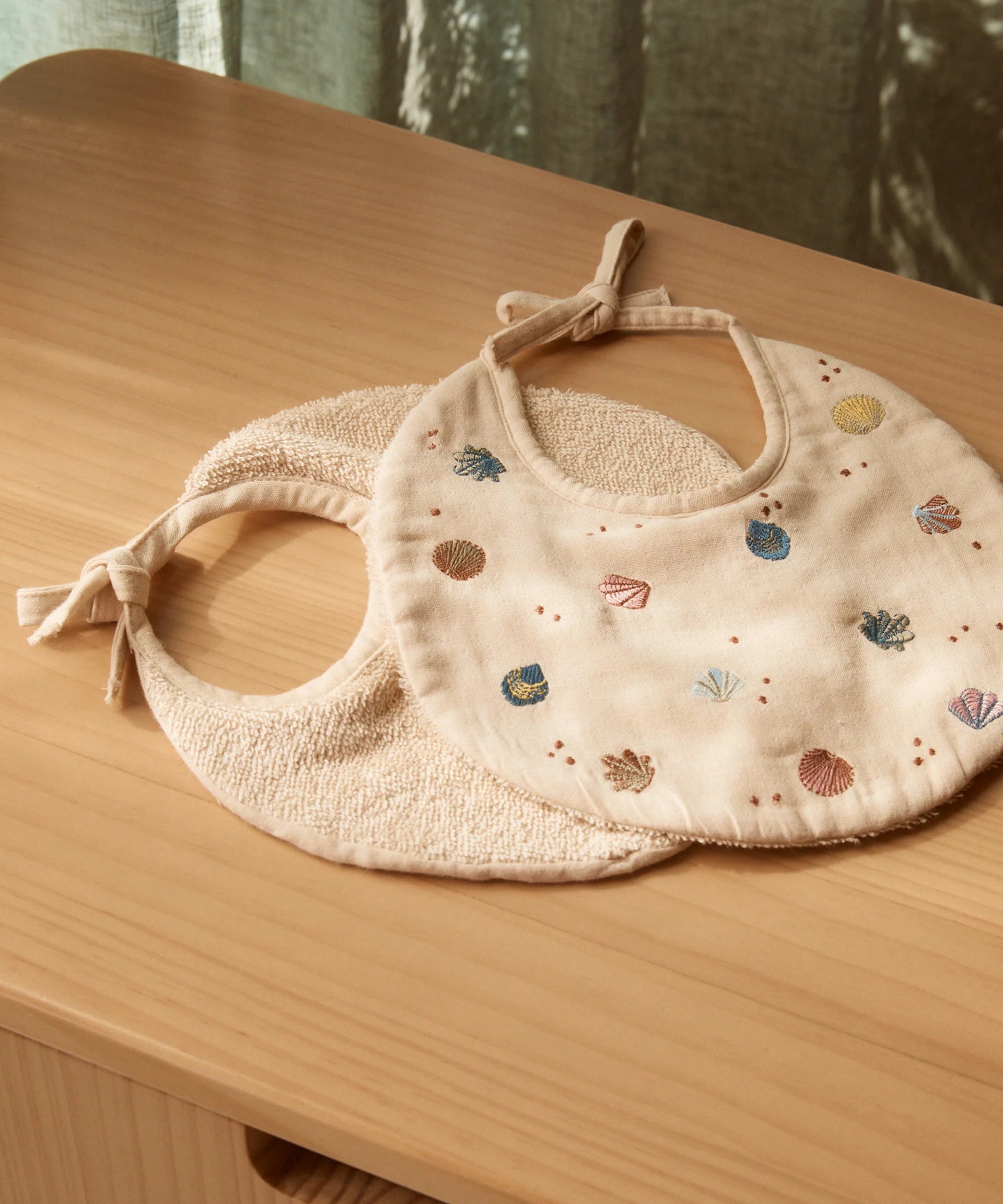 A round double-sided bib made from cotton muslin and finished with embroidered seashells, terry cotton lines the inside to maximise absorbency and comfort.