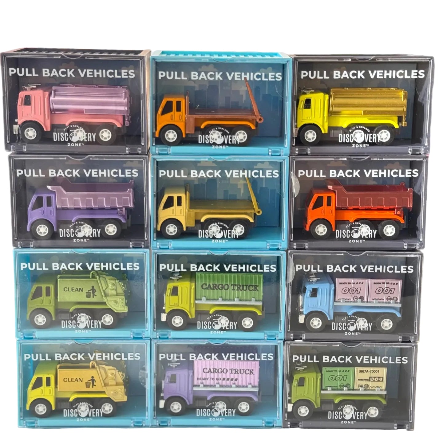 Diecast metal pull-back truck in a plastic shipping container for storage.