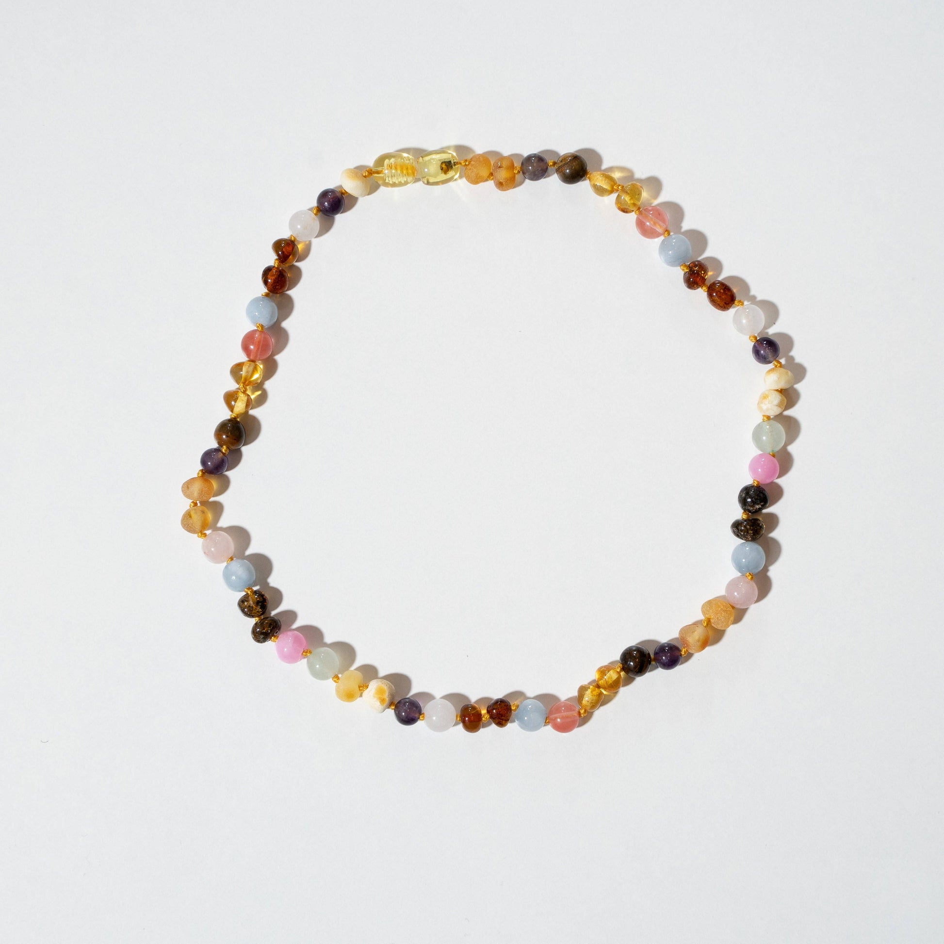 Our popular Rainbow necklace is a mix of Amber and Gemstones. You will find Amethyst, Rose Quartz, Aventurine, Jade, Cherry Quartz, Moonstone & labradorite. Safety clasp