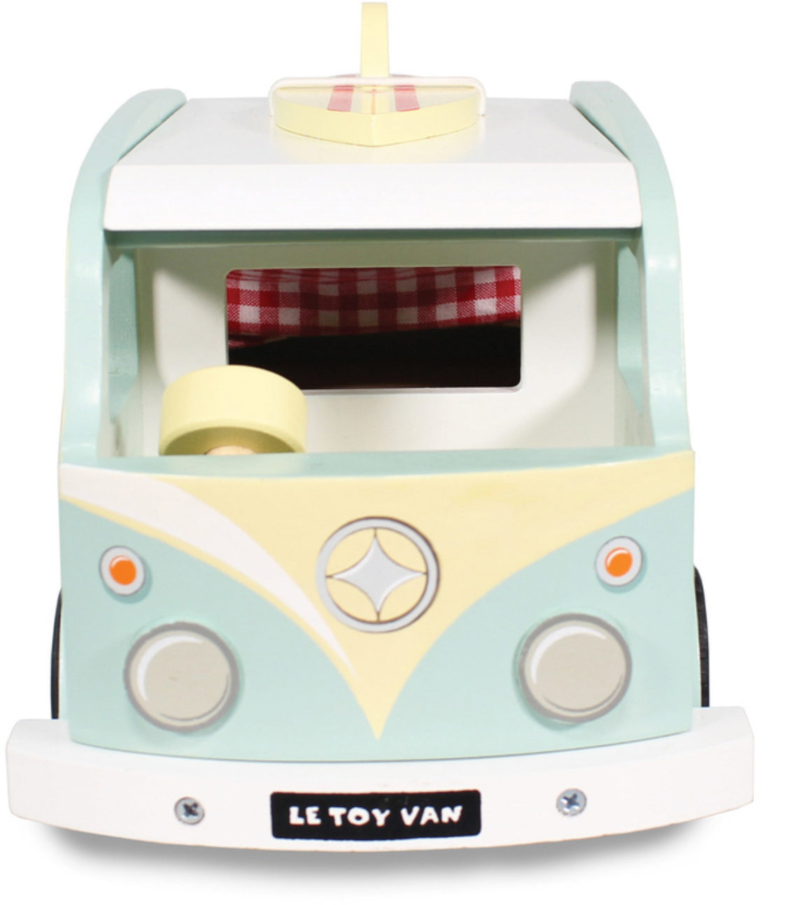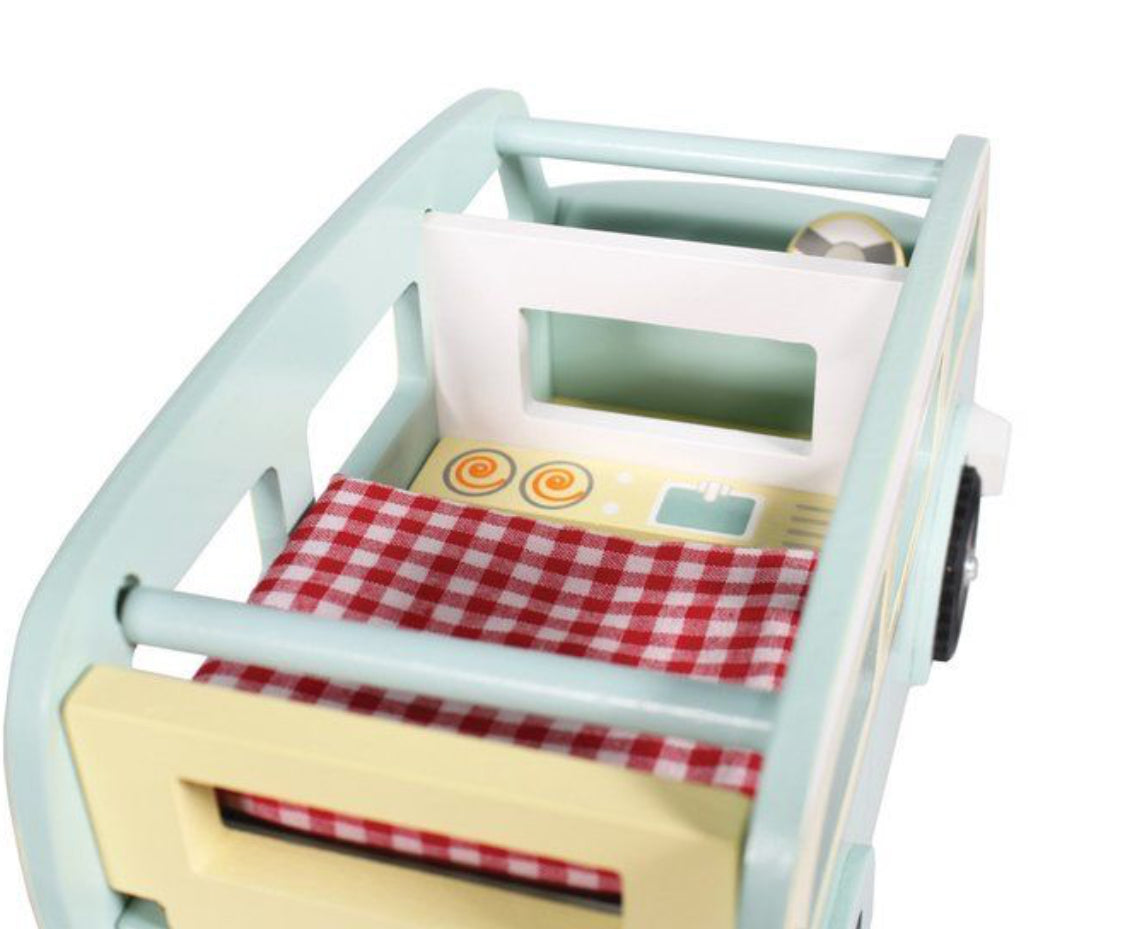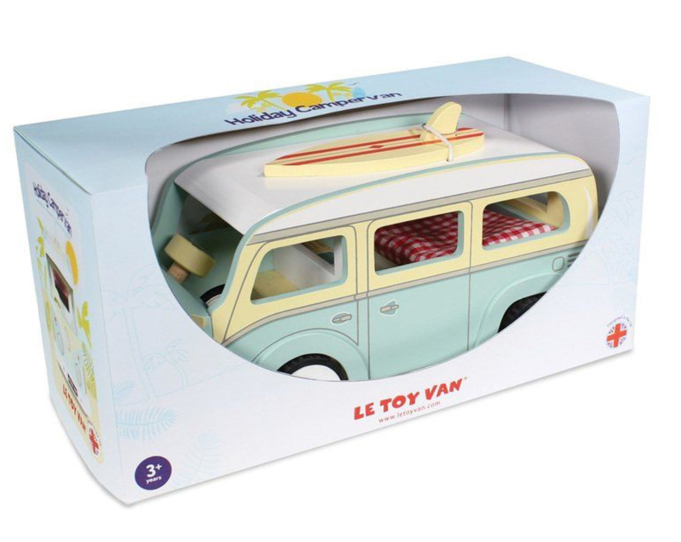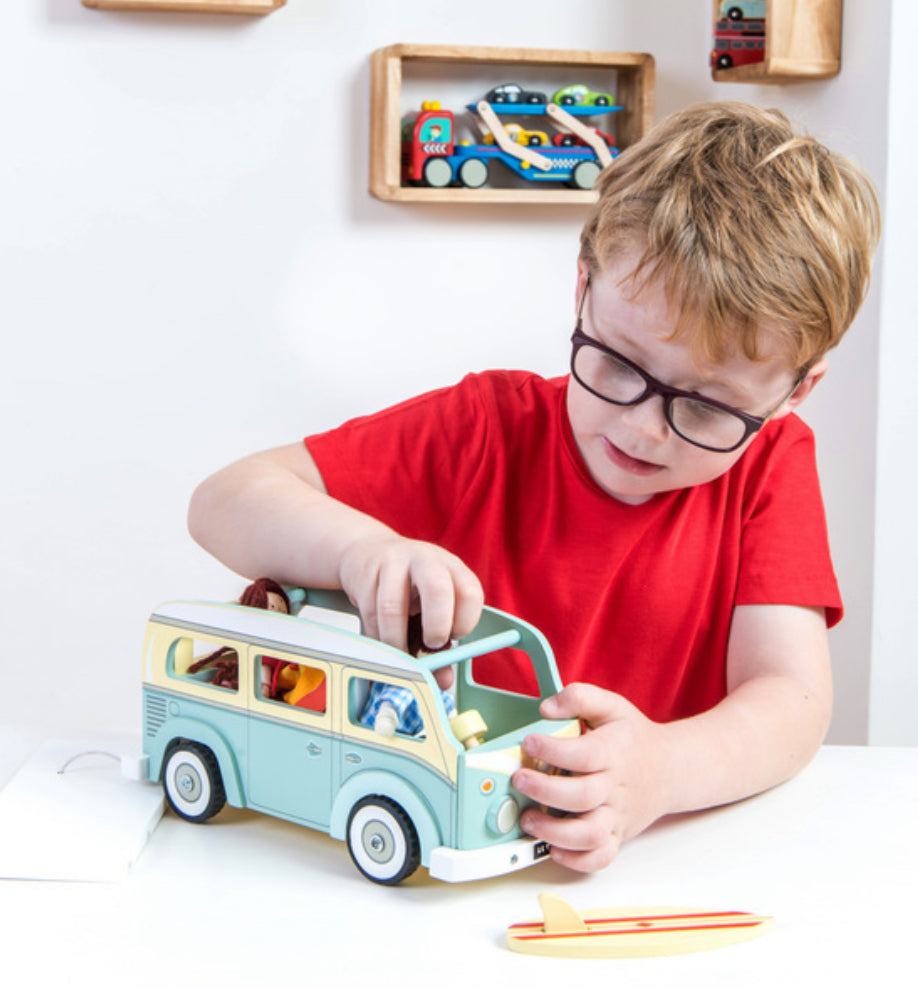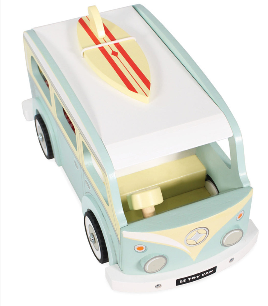 Classic holiday vehicle, complete with detachable surfboard and removeable roof. Campervan includes padded mattress and kitchenette area