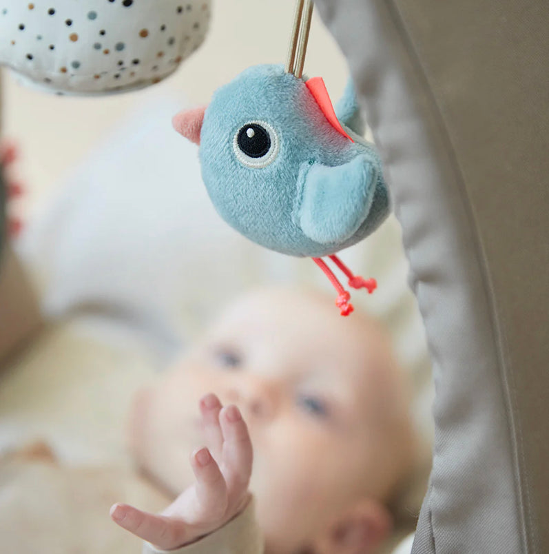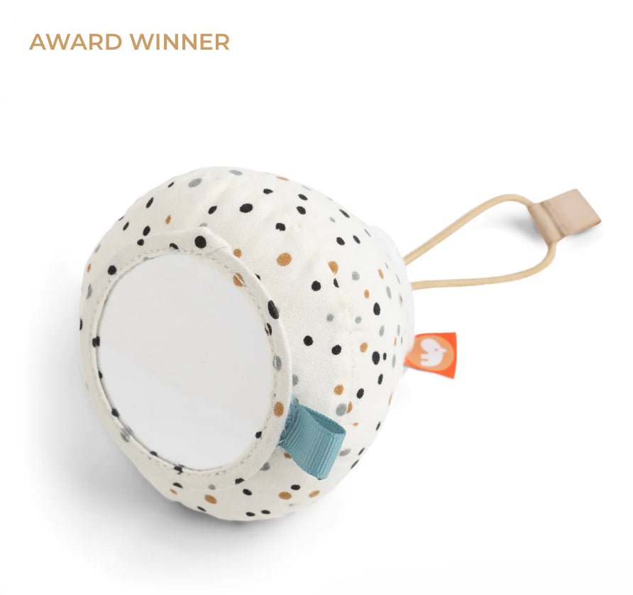 The feet of the arch have a mirror on one side and a discovery textile patch on the other. When you change the position of the feet, you change the height of the arch so the toys hang low or closer together and higher up depending on how you want them to hang. Toys may also be moved or more added.